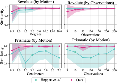 Our results demonstrate a high degree of accuracy, even with a small number of measurements. After only 0.5 ° of rotation, our estimator has an average tangent similarly of 0.90, after 1.0 °, this improves to 0.97. This enables online articulation estimation in cases where the neural network prediction is wrong because the robot part will only need to move the articulated part a small amount for the estimate to be updated. Additionally, we show that for equally spaced measurements throughout the configuration range, as few as 3 measurements can be sufficient to accurately estimate the joint. In comparison with Heppert et al., both methods have similar performance for revolute joints, while our method is better at distinguishing prismatic joints. We suspect this is because we check for prismatic articulations, whereas their method tends to confuse prismatic joints with very large revolute articulations.