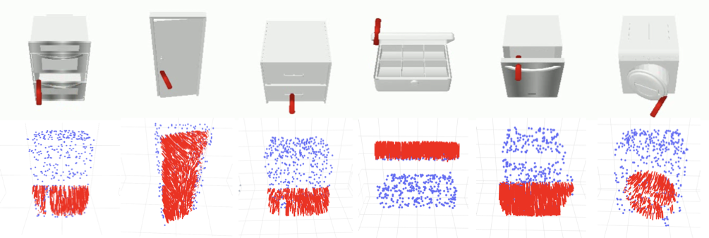 Earlier learning-based works explicitly classified objects for the prediction of articulation, but more recently, there has been a focus on learning category-free articulation affordancesĀ (), which describe how a user can interact with an object without classifying the object from vision. This is typically parameterized as a normalized vector that describes the motion of a point on the articulated part of an object. used a neural network to also predict grasp pose on the object as well as the opening trajectory from human demonstrations. Some recent learning-based work has incorporated interaction. used point cloud data collected before and after human interaction with the target articulated object. introduced a method that predicts articulation as well as proposes an interaction through which to observe the motion and update the articulation estimate.