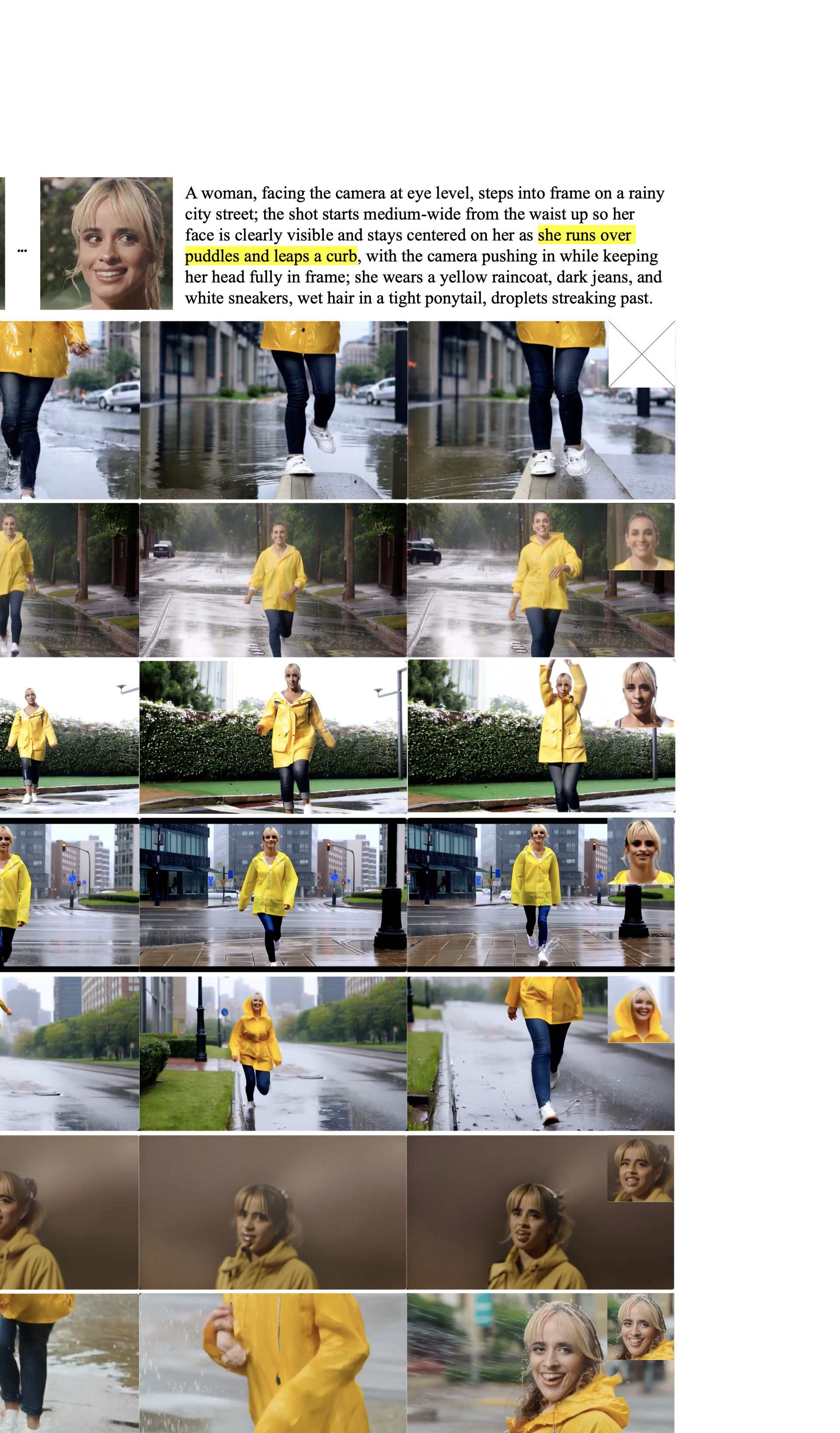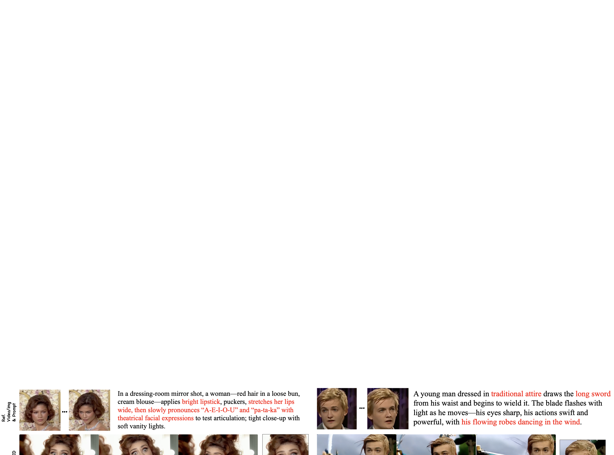 and prepend the weighted prefix $`[\widehat{\mathbf{C}}_{\mathrm{img}};\,\widehat{\mathbf{C}}_{\mathrm{id}}]`$ to the text tokens. In this way, early stages (larger $`w`$) bias cross-attention toward the clean, scene-agnostic anchors from the image, while later stages (smaller $`w`$) hand over to the richer temporal identity cues from the video.