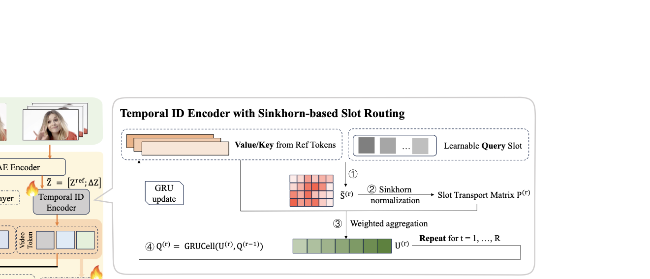 Given video VAE latents $`\mathbf{Z} \ \in \ \mathbb{R}^{B\times C\times T\times H\times W}`$, the encoder produces $`S`$ identity slots $`\mathbf{C}_{\mathrm{id}} \ \in \ \mathbb{R}^{B\times S\times D}`$. We first form a stacked latent volume $`\tilde{\mathbf{Z}}\ =\ [\mathbf{Z},\,\Delta\mathbf{Z}]`$ to expose short-term dynamics, apply a strided 3D patch embedding, and obtain a token sequence $`\mathbf{X} \ \in \ \mathbb{R}^{B\times L\times D}`$. A few lightweight spatioâtemporal self-attention (STSA) blocks further mix context using 3D RoPE, and Flash-style kernels ; followed by a Sinkhorn-routed slot reader that converts $`\mathbf{X}`$ into identity slots. This reader distills motion-robust, person-specific evidence into a compact set of slots that condition the generator.