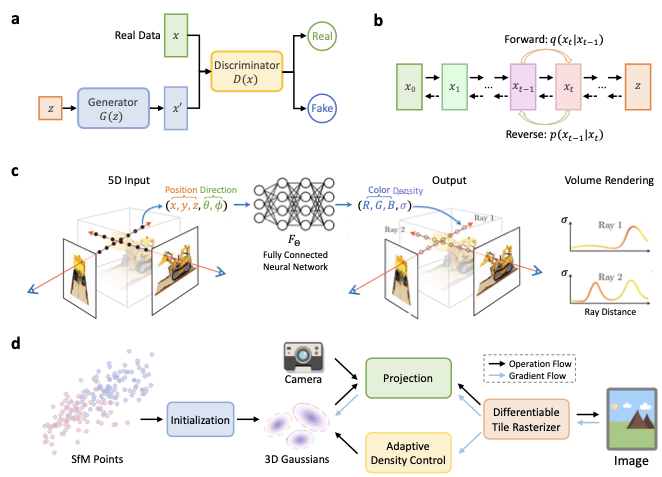 Generative Adversarial Neural Networks (GANs).  GANs is a kind of powerful framework (as shown in Figure 3) for learning data distributions, consisting of two main components: a generator ($`G`$) and a discriminator ($`D`$). These components are typically implemented as differentiable neural networks that map input data from one space to another. The optimization of GANs can be formulated as a min-max game between the generator and discriminator, with the following objective: