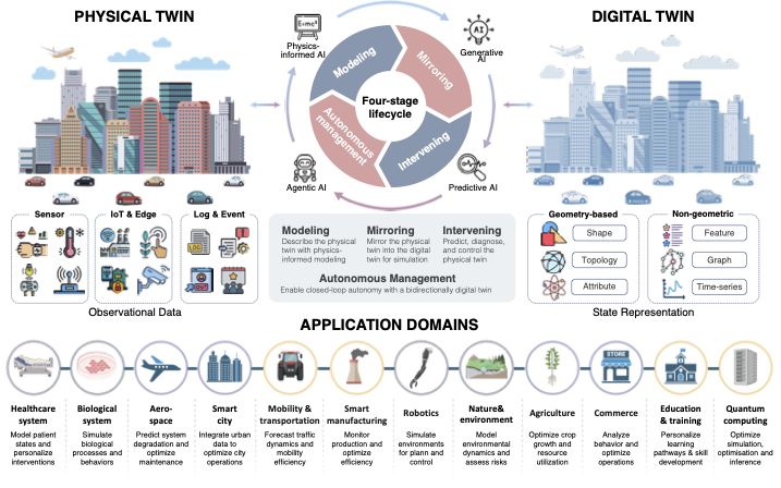 Digital twins (DT), as precise digital representations of physical twins (real-world entities or systems), are meticulously designed to maintain a bidirectional connection with their real-world systems, enabling state synchronization for monitoring, prediction, optimization, and decision support . Beyond mere replication, digital twins embody a paradigm shift from static digital mirrors to dynamic, continuously learning reflections of reality. Due to the inherent advantages of predictive analytics, dynamic system simulation, and operational optimization that digital twins provide, this technology has been widely used for healthcare , biological domain , urban planning and management , manufacture , and science . As NVIDIAâs founder and CEO, Jensen Huang, stated in a keynote at the Berlin Summit for the Earth Virtualization Engines initiative, AI and accelerated computing will revolutionize our understanding of complex systems , highlighting a new era where digital twins evolve from analytical tools into intelligent agents that learn, predict, and act upon the physical world.