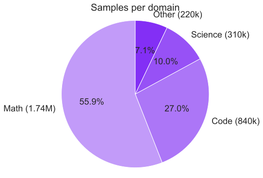 We curated a diverse set of datasets spanning different domains, including mathematics, coding, STEM, instruction-following, tool calling, and general chat, from which long chain-of-thoughts have been generated. Datasets were then organized into four primary domains as depicted in Fig. 2: mathematics, coding (with an emphasis on Python and C++), science, and other, comprising the remaining domains. For coding data, we emphasized algorithmic reasoning and functional correctness. In contrast, for mathematics and science tasks, we prioritized problems with verified ground-truth answers, resorting to an LLM-based judge only when such labels were unavailable.
