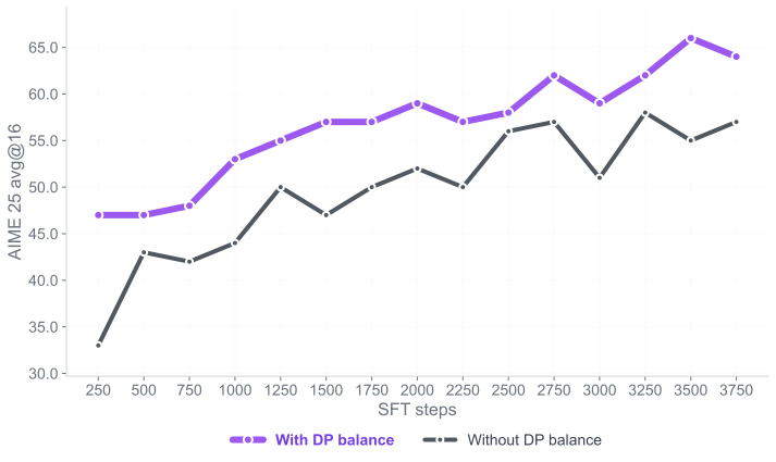 To further expand the base model reasoning capabilities, the current paradigm relies first on cold-start supervised fine-tuning stage. This is particularly motivated by , which shows that while RLVR-training does indeed improve average accuracy (e.g., at pass@1), a deeper analysis reveals that the coverage of solvable problems (measured by pass@k for large k) is narrower than or equal to the base model’s, essentially all reasoning paths discovered by the RL-training are already present in the base model’s distribution. This section provides details on our SFT stage, which proved critical to performance improvements in our model, accounting for the majority of reasoning capability gains in our training pipeline.