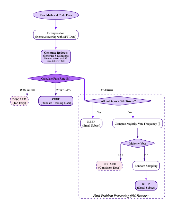 We implemented rigorous data verification, including selecting mathematical and science solutions based on correctness and cross-validating factual questions using official web sources when applicable. For mathematics, we relied on both math-verify2 and LLM-based verification for greater flexibility. Only correct solutions were kept, except for particularly difficult incorrect solutions or hardly verifiable problems such as theorems, which were retained to expose the models to complex reasoning traces as shown to be effective in .
