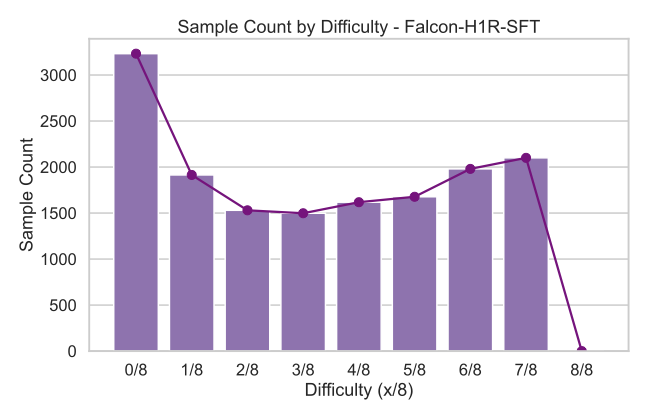 Figure 6 presents a comparison of inference throughput using vLLM between the transformer-based Qwen3-8B model and the hybrid Falcon-H1R-7B architecture (Table 8). Evaluations spanned batch sizes from $`2`$ to $`128`$ and averaged two input-output token configurations: (i) $`512`$ input tokens with $`32`$K output tokens, and (ii) $`8`$K input tokens with $`16`$K output tokens. To ensure fair and representative comparisons, we selected the optimal parallelism configuration for each regime: small batches ($`\text{BS}=2`$) used TP1; medium batches ($`\text{BS}=8`$ and $`\text{BS}=16`$) used TP2; and the largest batches ($`\text{BS}=32, 64, 128`$) used TP4 for Qwen3-8B and DP2 with TP2 for Falcon-H1R-7B, maximizing throughput for each architecture. All measurements were taken on NVIDIA H100 GPUs. Falcon-H1R-7B shows clear advantages at medium to large output reasoning lengths (16K–32K) and higher batch sizes, consistently surpassing Qwen3-8B with throughput improvements of $`+20\%`$ to $`+100\%`$.