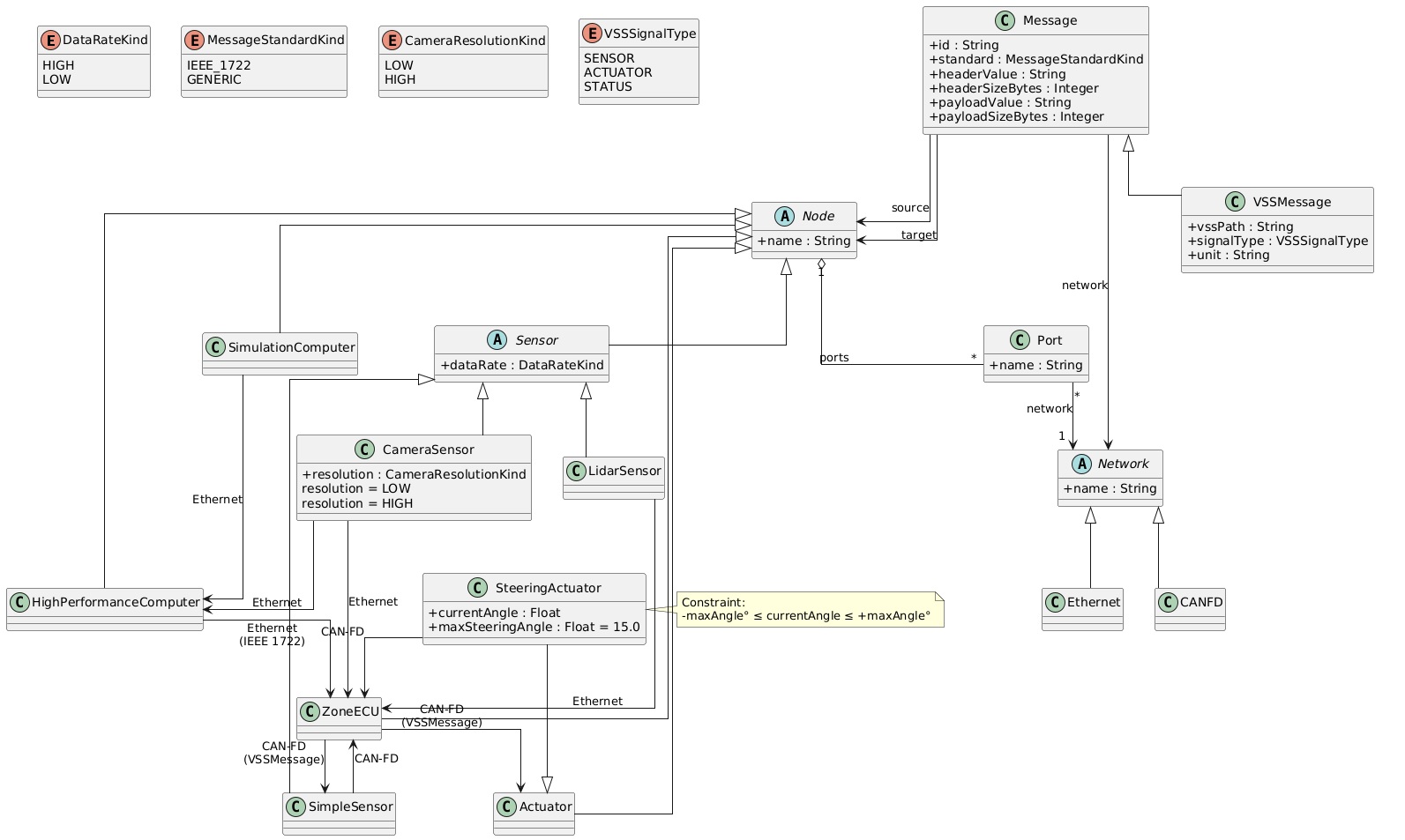 Let us assume that user specifies component-level connectivity requirements: “Simulation computer is connected to in-vehicle high-performance computer via Ethernet. Moreover, in-vehicle High-performance computer is connected to Zone ECU via Ethernet and sends IEEE 1722-compliant messages to it. On the other side, high data rate sensors (such as lower resolution camera, LIDAR) are connected via Ethernet to Zone ECU, while simpler sensors and actuators are connected via CAN-FD. Higher resolution back and front cameras are connected to high-performance computer via Ethernet as well. Additionally, VSS message-level communication should be available from ZoneECU to connected devices via CAN, while it should include status aspects, actuator commands as well as sensing information”. Underlying metamodel is given in Fig. 4. Additionally, example OCL rules encapsulating the main constraints when it comes to design-level security are given in what follows. The SteeringCommandWithinLimits rule ensures that any message sent to a steering actuator contains a steering angle command within the safe range of -15 to +15 degrees, preventing unsafe steering commands at the communication level, as the physical testbench might be potentially damaged by larger angles.The HPCtoZoneEthernetIEEE1722 rule enforces the architectural constraint that all messages from the High-Performance Computer to the Zone ECU must be transmitted over Ethernet and comply with the IEEE 1722 standard, ensuring correct use of the backbone network. The TargetSpeedWithinSafetyLimit rule guarantees that VSS messages defining the target vehicle speed do not exceed 30 km/h, enforcing a global safety limit on speed commands regardless of the sender or network.