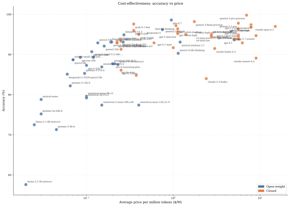 The evaluation covers 72 models accessed through two API providers: Azure OpenAI and OpenRouter . The evaluation ran in December 2025. Models come from OpenAI (GPT-4o, GPT-4.1, GPT-5 series, o3-mini, o4-mini), Anthropic (Claude 3.5 Haiku, Claude 3.7 Sonnet, Claude Opus 4.5, Claude Sonnet 4.5, Claude Haiku 4.5), Google (Gemini 2.0, 2.5, 3 series, Gemma 3), Meta (Llama 3.1, 3.2, 4), DeepSeek (R1, V3.2), Mistral (Small, Medium, Nemo, Ministral), Alibaba (Qwen3 series), Zhipu (GLM-4, GLM-4.7), xAI (Grok 3, 4), Moonshot (Kimi K2), MiniMax (M2), Microsoft (Phi-4) and Nvidia (Nemotron).