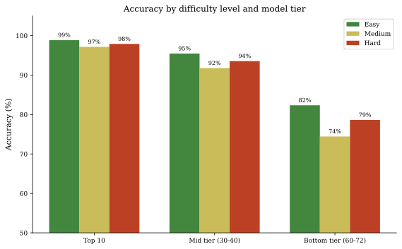 For benchmarking purposes, these residual biases should not significantly affect relative comparisons. Since the same patterns apply to all questions, any bias-based advantage would affect all models equally, preserving the validity of model-to-model comparisons. The major exploits (length as a proxy for correctness, âalwaysâ as a marker for wrong answers, âmayâ as a marker for correct answers) have been addressed. After mitigation, correct answers average 87 characters versus 74 for distractors, a difference of roughly 13 characters (2â3 words). With the uniquely longest answer correct only 43.2% of the time, a length-based strategy would fail more often than it succeeds. The remaining issues with absolute-word synonyms affect fewer than 10% of questions. These limitations are documented for transparency; see Appendix C for detailed before/after metrics.