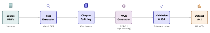 The full dataset (505 questions across 45+ chapters) was reviewed in batches for schema compliance and rationale consistency. In addition to human spot-checks, LLM-based batch review flagged potential inconsistencies between rationales and correct answers. The audit log records batch status and any issues requiring correction. Several questions required fixing during the final review pass.