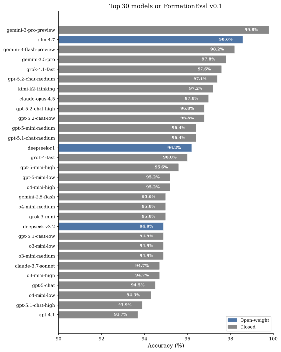 This paper presents FormationEval, an open multiple-choice question benchmark for evaluating language models on petroleum geoscience and subsurface disciplines. The dataset contains 505 questions across seven domains including petrophysics, petroleum geology and reservoir engineering, derived from three authoritative sources using a reasoning model with detailed instructions and a concept-based approach that avoids verbatim copying of copyrighted text. Each question includes source metadata to support traceability and audit. The evaluation covers 72 models from major providers including OpenAI, Anthropic, Google, Meta and open-weight alternatives. The top performers achieve over 97\% accuracy, with Gemini 3 Pro Preview reaching 99.8\%, while tier and domain gaps persist. Among open-weight models, GLM-4.7 leads at 98.6\%, with several DeepSeek, Llama, Qwen and Mistral models also exceeding 93\%. The performance gap between open-weight and closed models is narrower than expected, with several lower-cost open-weight models exceeding 90\% accuracy. Petrophysics emerges as the most challenging domain across all models, while smaller models show wider performance variance. Residual length bias in the dataset (correct answers tend to be longer) is documented along with bias mitigation strategies applied during construction. The benchmark, evaluation code and results are publicly available.đĄ Summary & Analysis