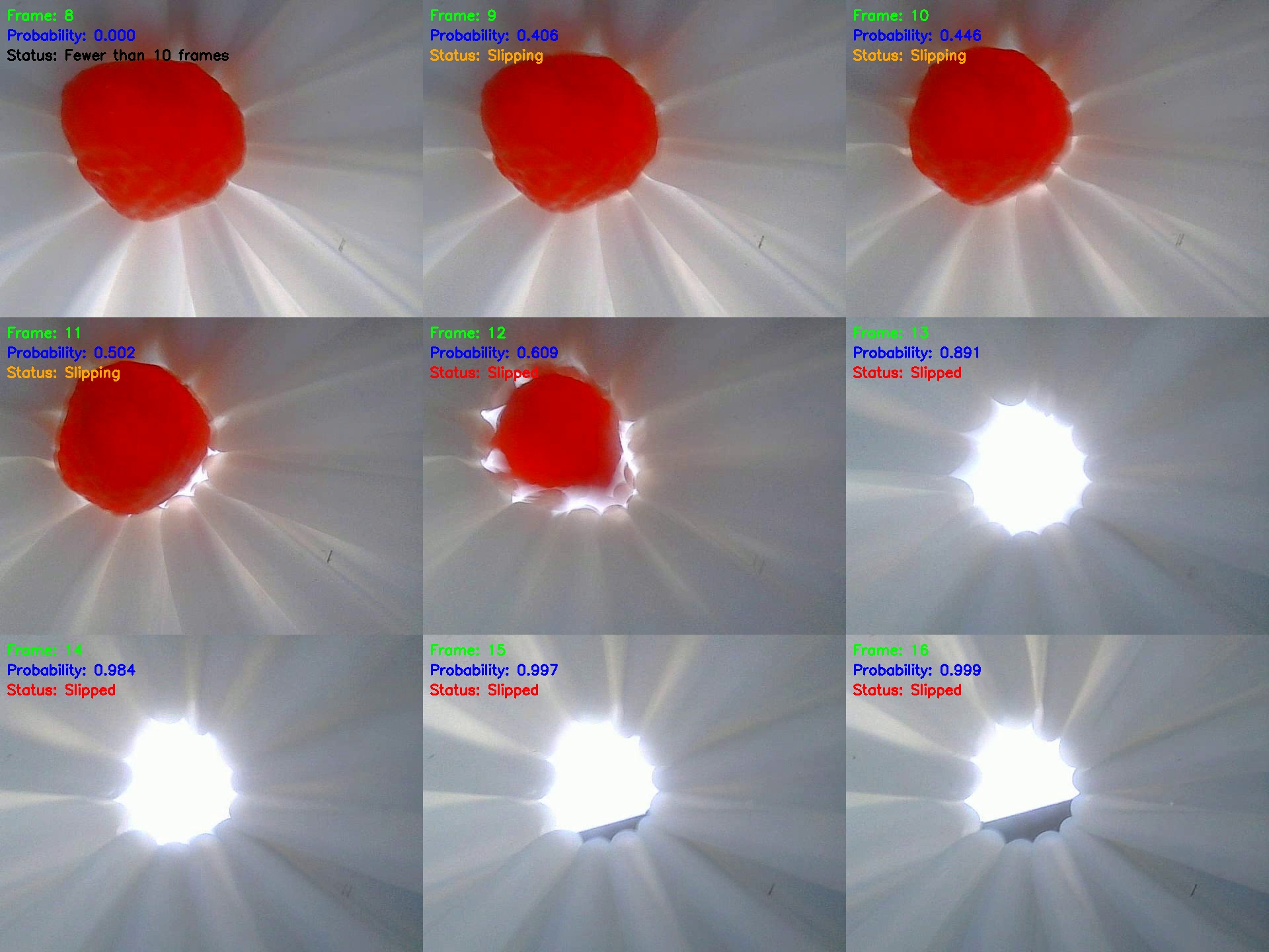If the total number of frames did not reach 10, fewer than 10 frames were displayed as labels in the top-left corner of the images. The strawberry began slipping between frames 9 and 11, with corresponding probabilities of 0.406, 0.446, and 0.502. From frame 13 onward, the strawberry was considered slipped. Similarly, a probability curve of strawberry slippage was plotted for intuitive observation, as shown in the right panel of Fig. 11.