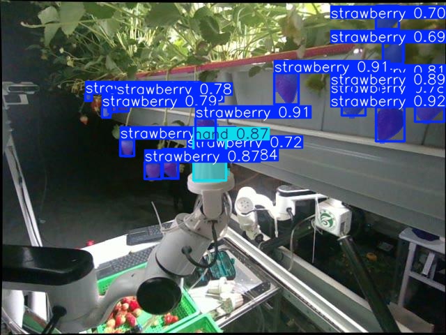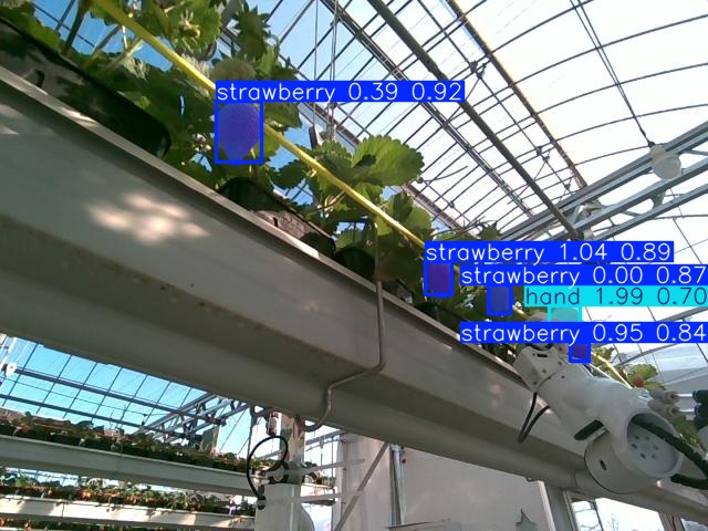SRR-Net, which integrated multi-task learning for both strawberry and hand classes, was evaluated on the FaultData dataset for detection, segmentation, and ripeness estimation in Table. [tbl-perception]. For bounding box prediction, it achieved a precision of 0.895, recall of 0.813, mAP@50 of 0.884, and mAP@50-95 of 0.633 for strawberries, while for the hand class, the corresponding values were 0.972, 0.958, 0.977, and 0.788, respectively. In segmentation, SRR-Net reached a precision of 0.887, recall of 0.747, mAP@50 of 0.829, and mAP@50-95 of 0.448 for strawberries, and 0.974, 0.947, 0.964, and 0.655 for hands.