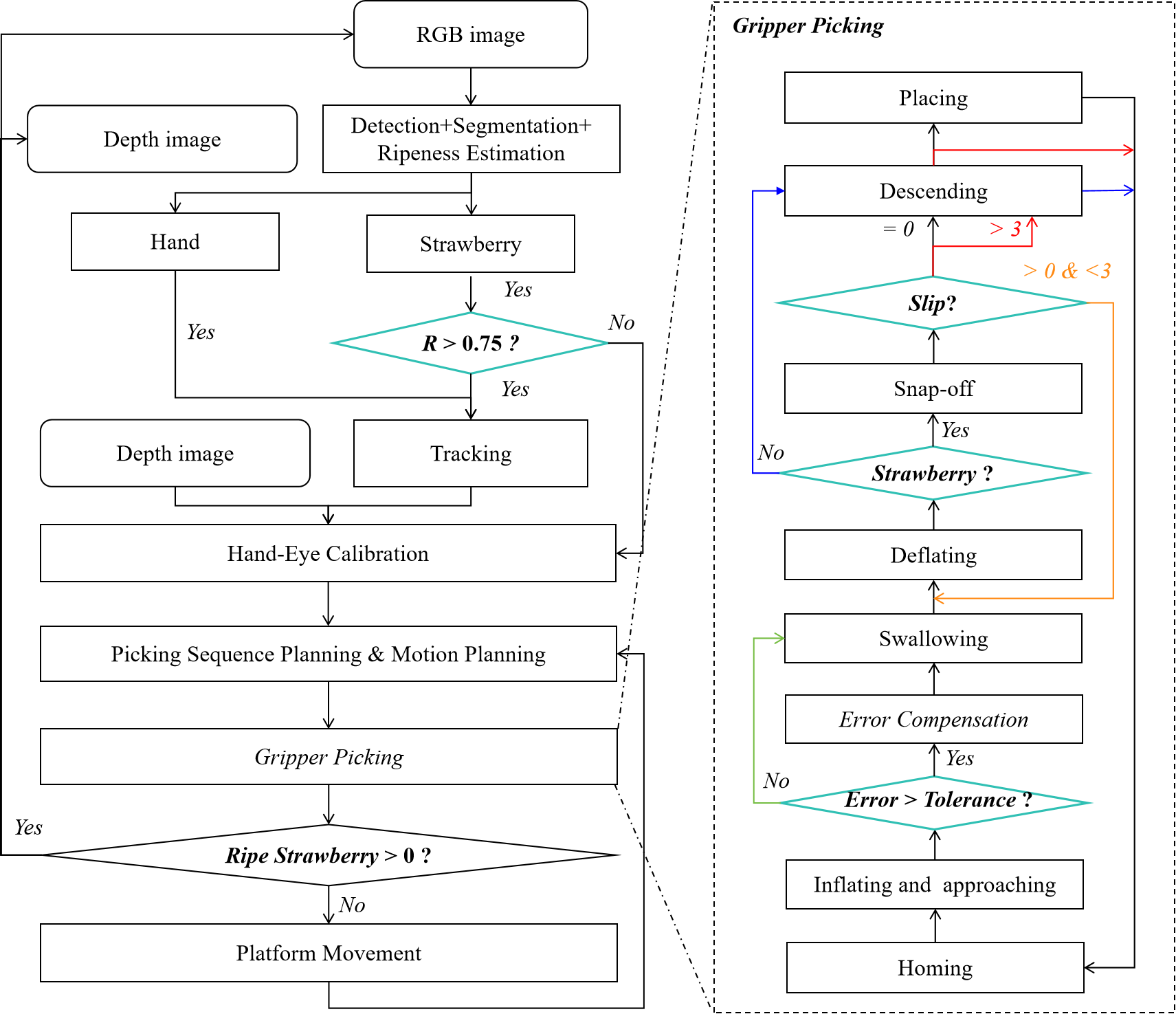To enhance reliability, a time-stability rule was implemented. If slippage was predicted in three consecutive instances, an early abort signal was triggered, the placing stage was skipped, and the next picking cycle began. If the number of slipping instances was greater than zero but less than three, a secondary picking mechanism was activated, bypassing the inflating and approaching and swallowing stages, with the gripper inflating and deflating to re-grasp the strawberry during the snap-off actions. When no slip was predicted, the robot proceeded with the remaining steps until the cycle was completed.