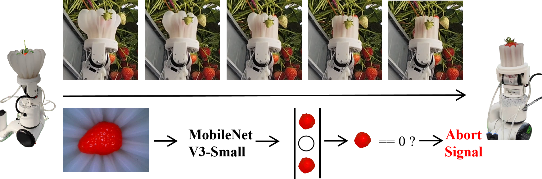 To enhance operational reliability, an early abort strategy was implemented. During the deflating stage, MobileNet V3-Small was used to classify whether the strawberry had been successfully grasped. Subsequently, in the snap-off stage, an LSTM classifier predicted the likelihood of fruit slippage from the gripper, enabling timely corrective actions.