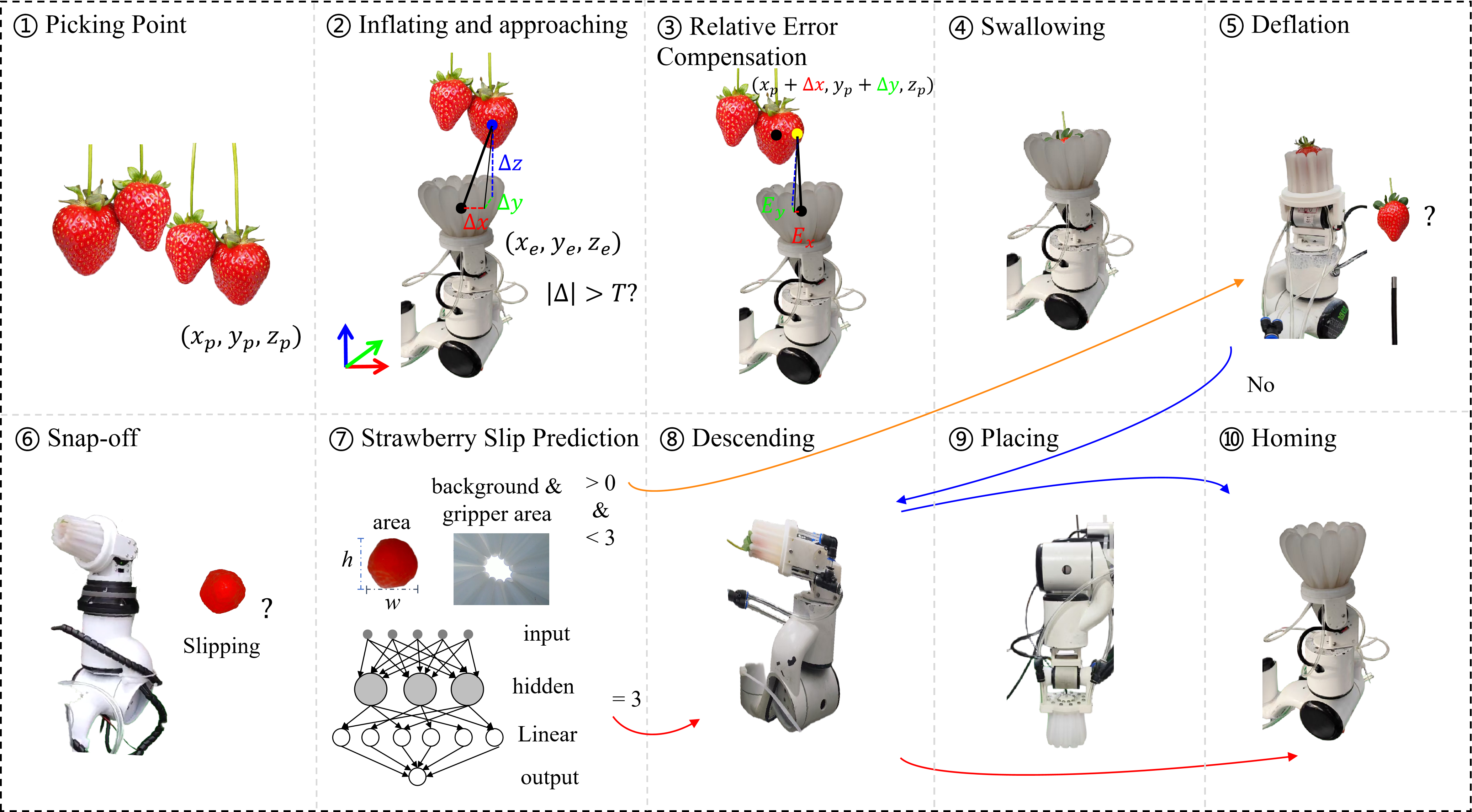 In the HarvestFlex arm’s workflow, a relative error compensation method was incorporated into the inflating and approaching and swallowing stages of the picking process, in Fig. 5.