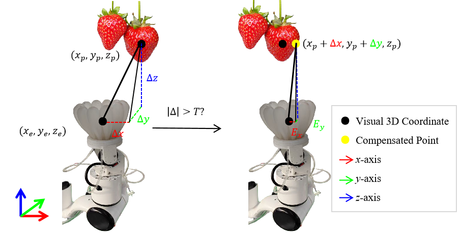 Since the snap-off stage necessitated bending the strawberry stem, the vertical position of gripper during the swallowing stage was adjusted to exceed that of the picking point. To simplify computation and reduce processing overhead, only the $`x`$- and $`y`$-axis errors were considered, while $`z`$-axis errors were ignored. Given an error tolerance threshold $`T`$, when the end-effector reached a position beneath the picking point and the absolute error exceeded $`T`$, the compensated picking point coordinates $`(x_c,y_c,z_c)`$ were computed as: