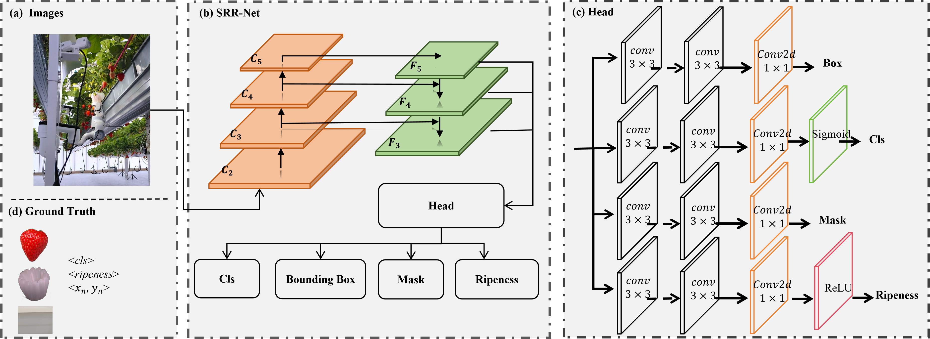 An end-to-end multi-task perception method, SRR-Net, was introduced to simultaneously perform detection, segmentation, and ripeness estimation of both strawberries and gripper. This method integrated low- and high-level feature representations with ripeness and biological attributes to comprehensively perceive strawberries and reduce errors in ripeness estimation. The method employed a lightweight network with shared weights. For strawberries, the perception task distinguished between ripe and unripe fruits via post-processing classification. For the robotic gripper, relative error between the gripper and the picking point was calculated.