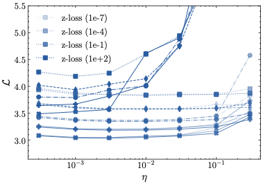 This behavior stands in contrast to z-loss, which requires more careful tuning. Severe divergences appear for $`\lambda=10^2`$, but also for lower values of $`\lambda`$ in conjunction with large learning rates. Our results indicate that the optimal value for z-loss is $`\lambda=10^{-1}`$, which is significantly larger than the previously assumed optimal value of $`10^{-4}`$. Importantly, however, even for the optimal $`\lambda`$, z-loss is outperformed by both $`\mu`$-loss and $`\mu`$-centering. This performance gap is evident in the learning rate sensitivity values for the largest model size $`N=221`$ in Tab. [tab:overview_comparison], as well as in the comparison of the rightmost points—corresponding to the largest model size—across the learning rate sensitivity plots in Fig. 8.