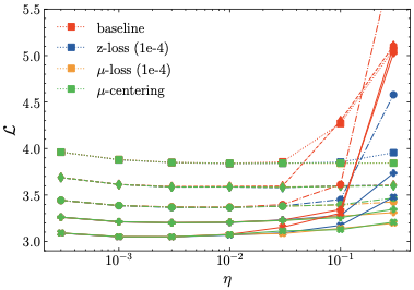 The top table (i) demonstrates that the optimal loss $`\min_\eta \mathcal{L}`$ for each model size is virtually the same for all methods. As expected, the top figure shows that the non-regularized baseline is the first to diverge with larger learning rates. Interestingly, z-loss leads to occasional divergences as well, given a large enough learning rate2. Meanwhile, none of the models using our methods diverge to any significant extent. This is also reflected in subtable (ii) of Tab. 4, which shows that $`\mu`$-loss and $`\mu`$-centering exhibit a lower learning rate sensitivity than z-loss, for all models sizes. In addition, subtable (iii) reveals that our methods are computationally cheap, such that the training time is minimally affected.