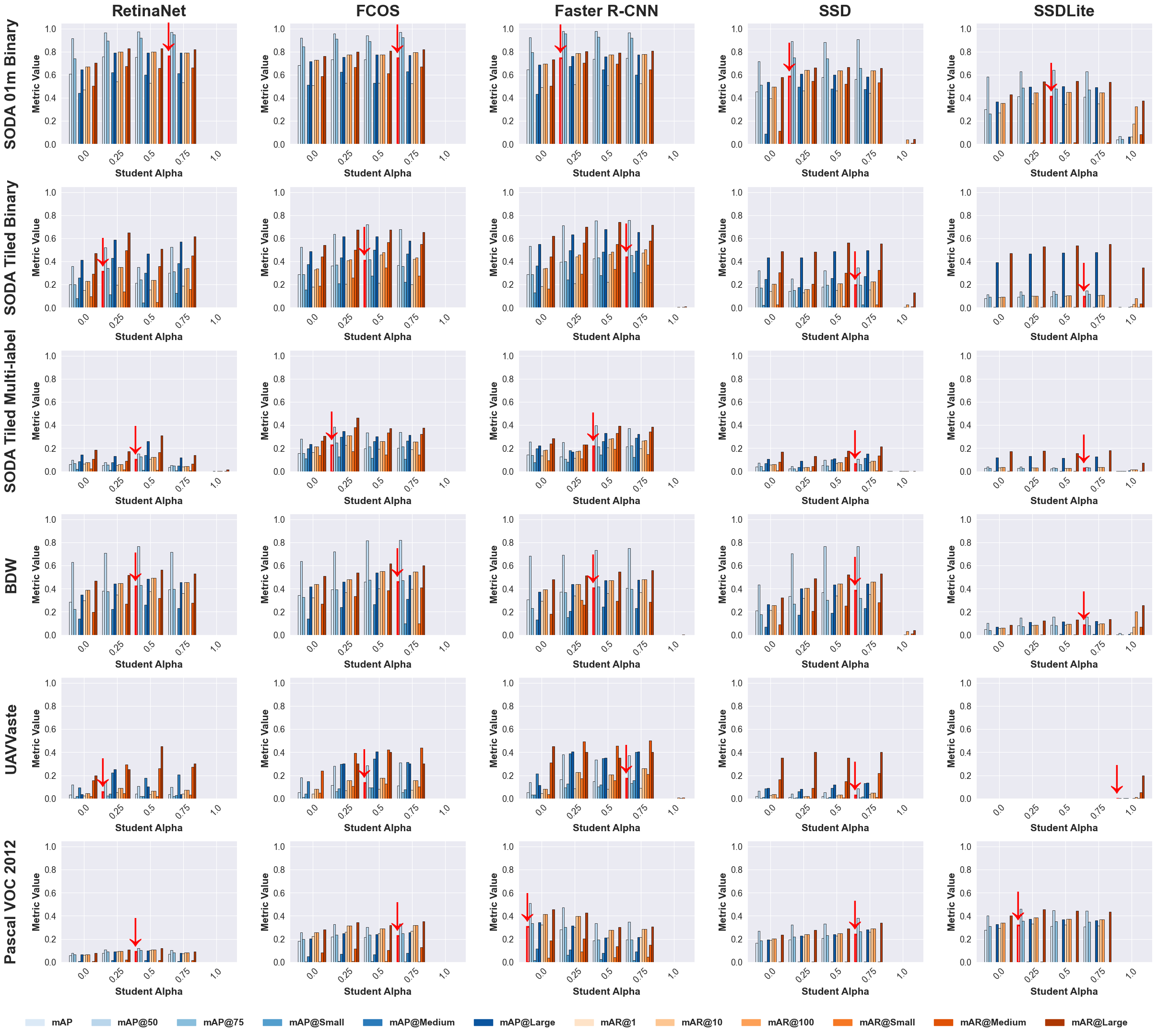 While the teacher models exhibited high accuracy and the student models consistently outperformed their baselines, it remains important to analyze how varying reliance on teacher guidance affects student learning. This dependency is governed by the parameter $`\alpha`$, which controls the weight of the teacherās contribution during knowledge transfer. Experiments were conducted with $`\alpha \in \{0, 0.25, 0.5, 0.75, 1\}`$, where $`\alpha = 0`$ corresponds to the baseline and $`\alpha = 1`$ to full teacher supervision. FigureĀ 5 summarizes the results across all datasets and architectures using COCO metrics, with red downward arrows indicating top performance in strict mAP@50ā95. Intermediate values of $`\alpha`$ (0.25 and 0.5) generally yield the best performance, balancing learning from ground-truth labels and teacher knowledge, while $`\alpha = 0.75`$ occasionally performs well and $`\alpha = 1`$ tends to underperform. These trends are consistent across datasets and models.