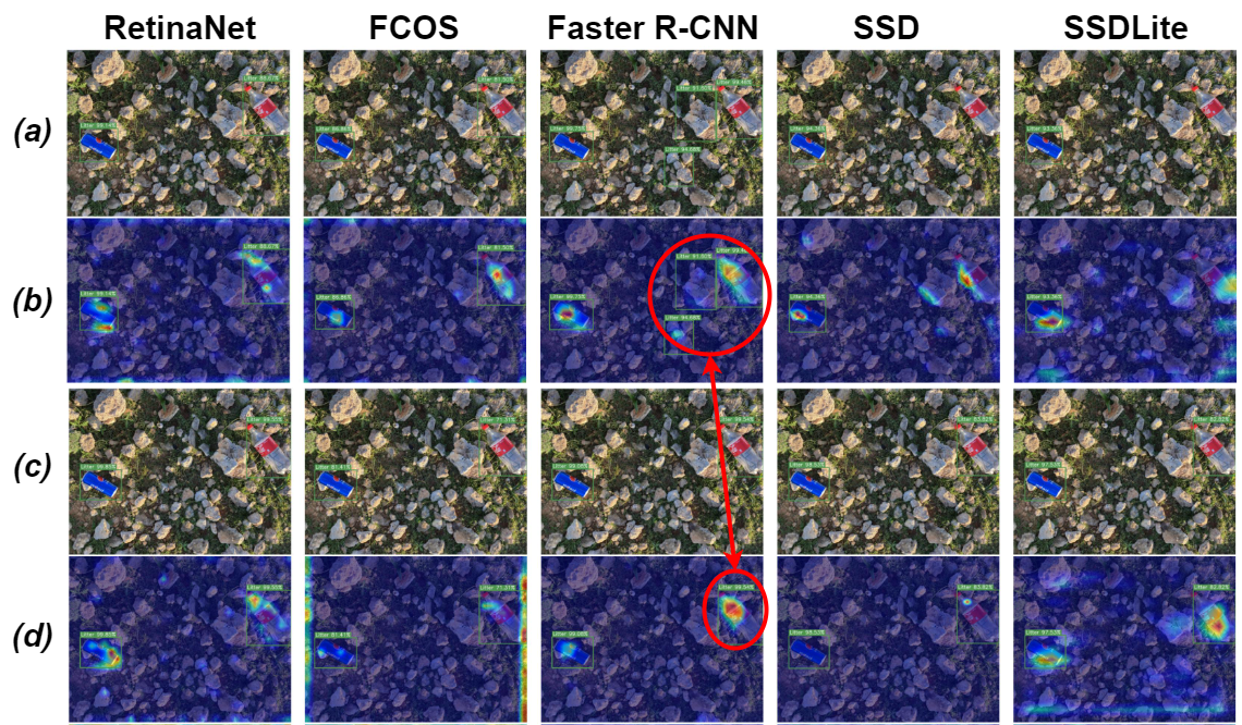 To further understand the performance improvements observed in LUPI-trained student models, we performed interpretability analysis using Grad-CAM visualisations on the final backbone layer. FigureĀ 6 shows results for the SODA 1-metre dataset, comparing baseline and student models. The visualisations show that LUPI-trained student models focus sharply on litter objects, producing higher-confidence detections with fewer misclassifications, whereas the baseline modelās attention is less concentrated and often highlights irrelevant areas in the background. This targeted attention aligns with the improvements observed in strict mAP and F1 score, indicating that the student models are not only performing better quantitatively but also learning more meaningful and task-relevant feature representations. Similar patterns were observed across the other datasets, though these results are omitted for brevity, indicating that the effect is consistent.
