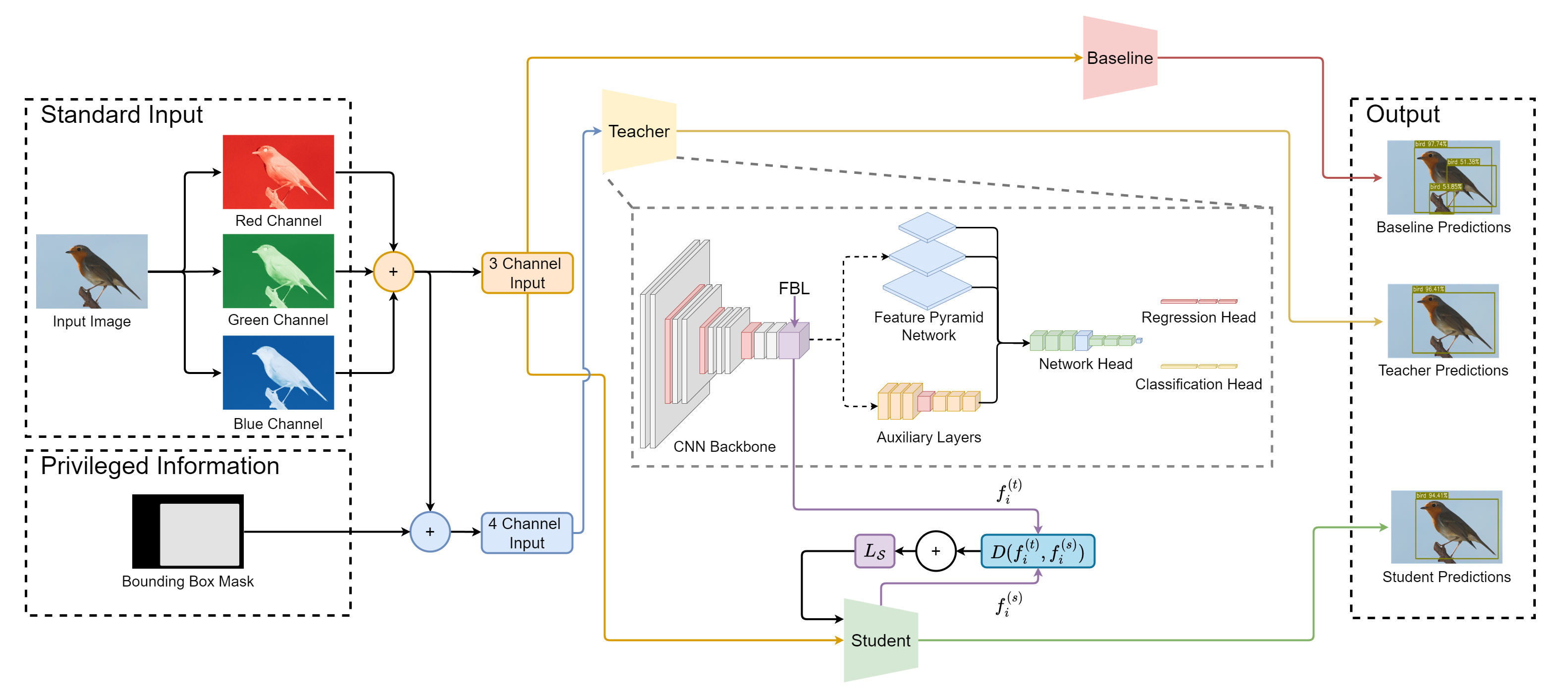We consider a supervised object detection setting where each training sample consists of a standard input image $`x \in X`$, additional privileged information $`x^* \in X^*`$ available only during training, and the corresponding ground-truth label $`y \in Y`$, which includes a bounding box $`b`$ and a class label $`l`$ per depicted object. The training dataset is therefore a set of triplets