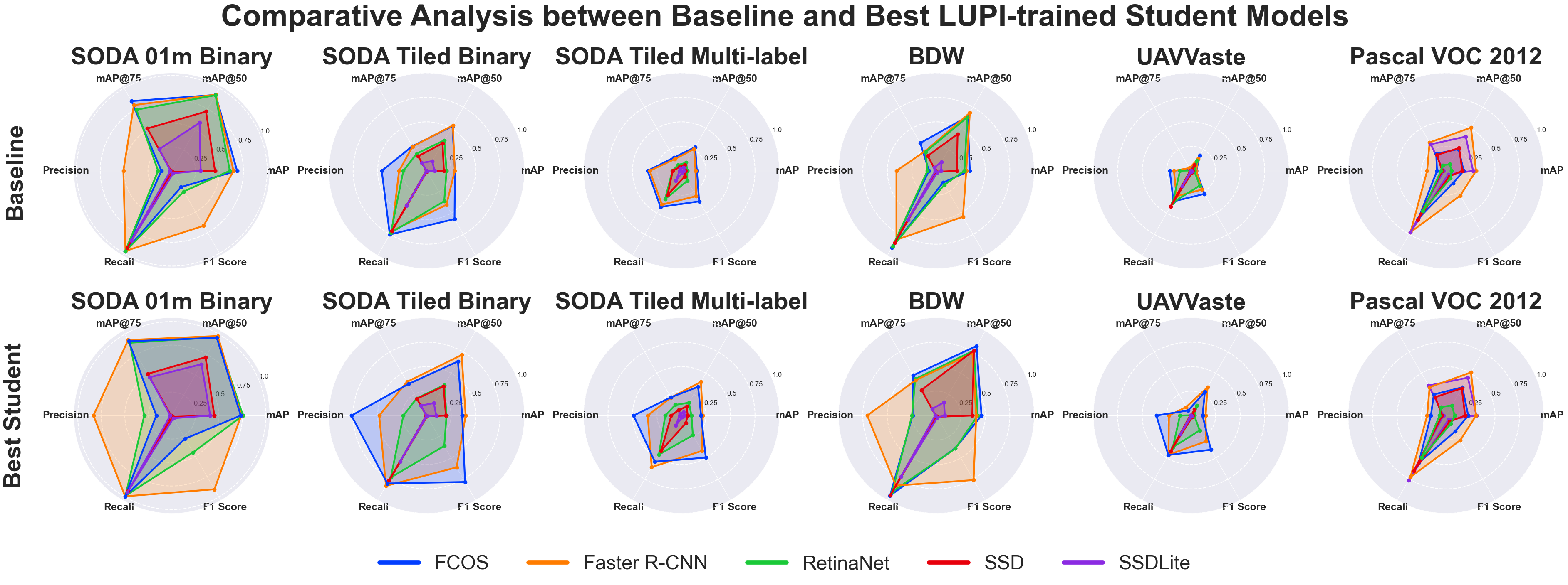 Following the teacher model evaluation, we assess the performance of LUPI-trained student models relative to their baseline RGB-only counterparts. FigureĀ 4 presents these comparisons across all datasets and detection architectures. Overall, student models show consistent gains over the baselines, particularly in strict mAP and F1 score metrics. The most substantial improvements are observed in within-dataset UAV litter detection, with smaller yet meaningful gains in cross-dataset evaluations. Faster R-CNN, FCOS, and RetinaNet benefit most from teacher guidance in UAV-based scenarios, whereas SSD and SSDLite exhibit clearer improvements on Pascal VOC. Although relative gains diminish in more demanding tasksāsuch as multi-label detection and cross-dataset generalizationāthe results confirm that LUPI effectively enhances student performance across architectures and domains.