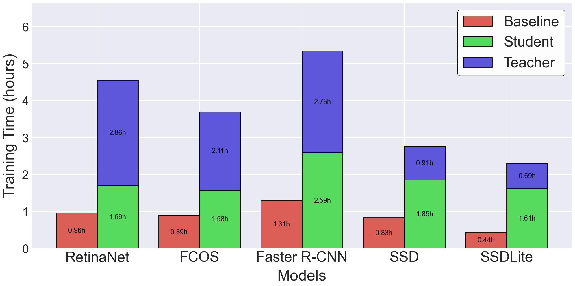 While we have consistently shown that the proposed LUPI-based object detection approach improves accuracy, one might question whether these results come at a substantial computational cost. A primary limitation is the increased training time, as both a teacher and a student model must be trained, effectively doubling the workload, as shown in FigureĀ 7. However, inference is typically performed far more frequently than training in practical deployments. TableĀ 1 shows that the baseline and LUPI-trained student models are nearly identical in size, number of parameters, GFLOPS, and FPS, with only minor variations in speed that were consistent across multiple runs. This demonstrates that while training requires more time, inference speed, model size, and efficiency remain unaffected, ensuring that the improved accuracy of LUPI-trained students can be fully utilised in deployment. For brevity, only Pascal VOC 2012 results are shown, though similar trends were observed across other datasets.