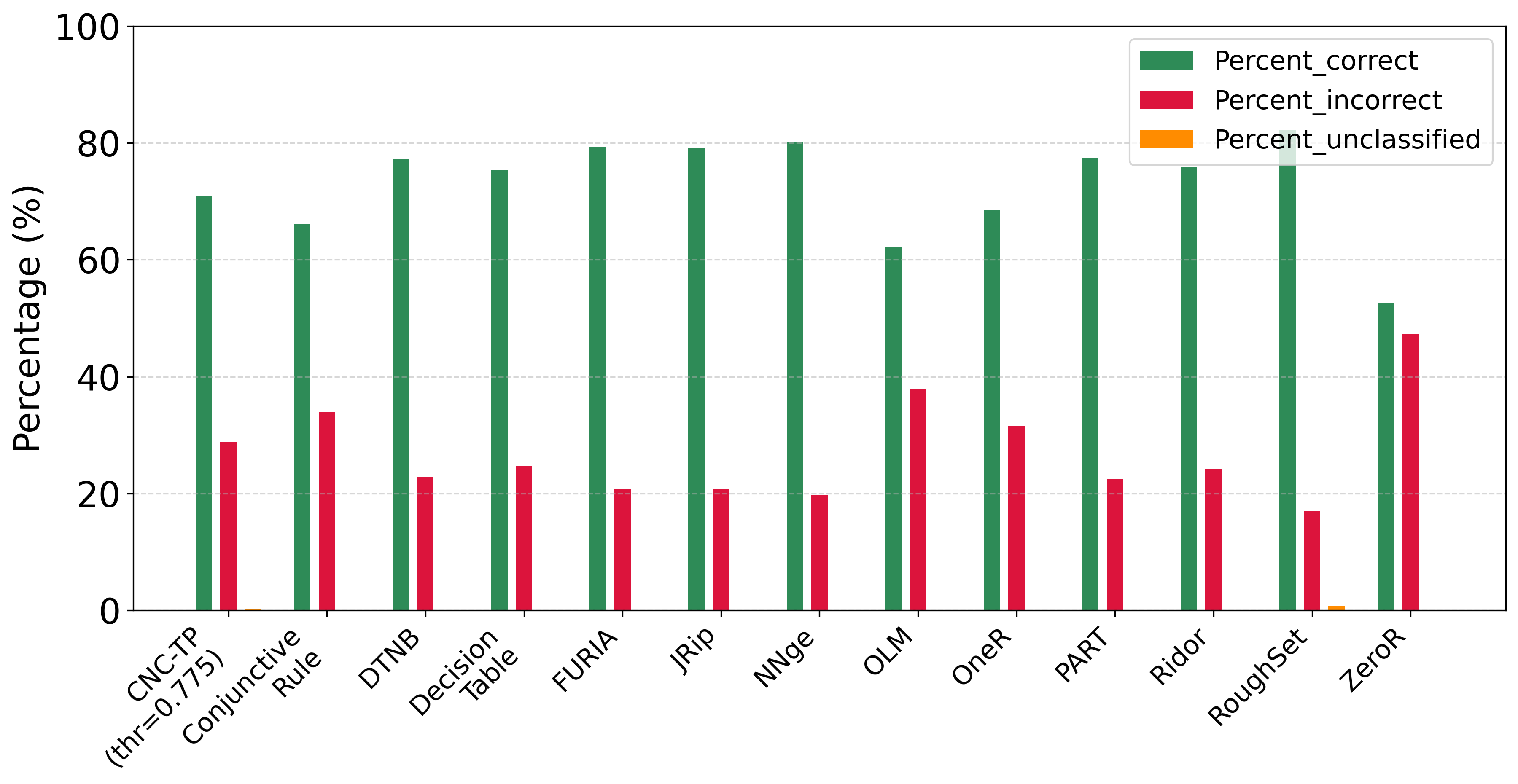 As shown in FigureĀ 6, CNC-TP demonstrates a lower rejection rate compared to RoughSet, and outperforms ConjunctiveRule, OLM, OneR, and ZeroR in terms of classification accuracy. Furthermore, its performance is comparable to more advanced rule-based classifiers such as DTNB, DecisionTable, FURIA, NNge, PART, and Ridor.