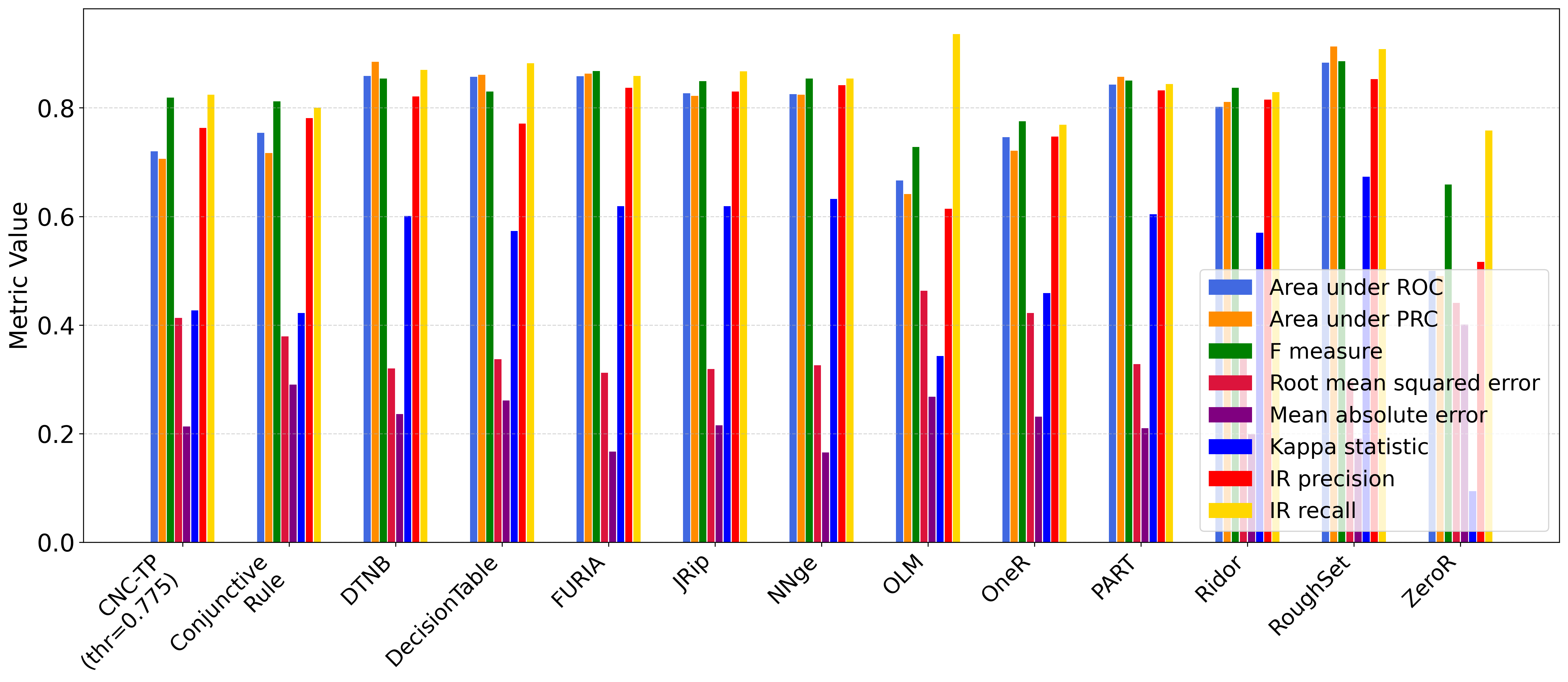 Regarding the Kappa statistic, CNC-TP ranks in the mid-range among the compared classifiers. While RoughSet achieves the highest Kappa value (0.673), and OLM the lowest (0.343), CNC-TP maintains a solid agreement between predictions and actual labels. Notably, ZeroR stands out with a near-zero Kappa, reflecting its inability to capture any meaningful classification pattern.