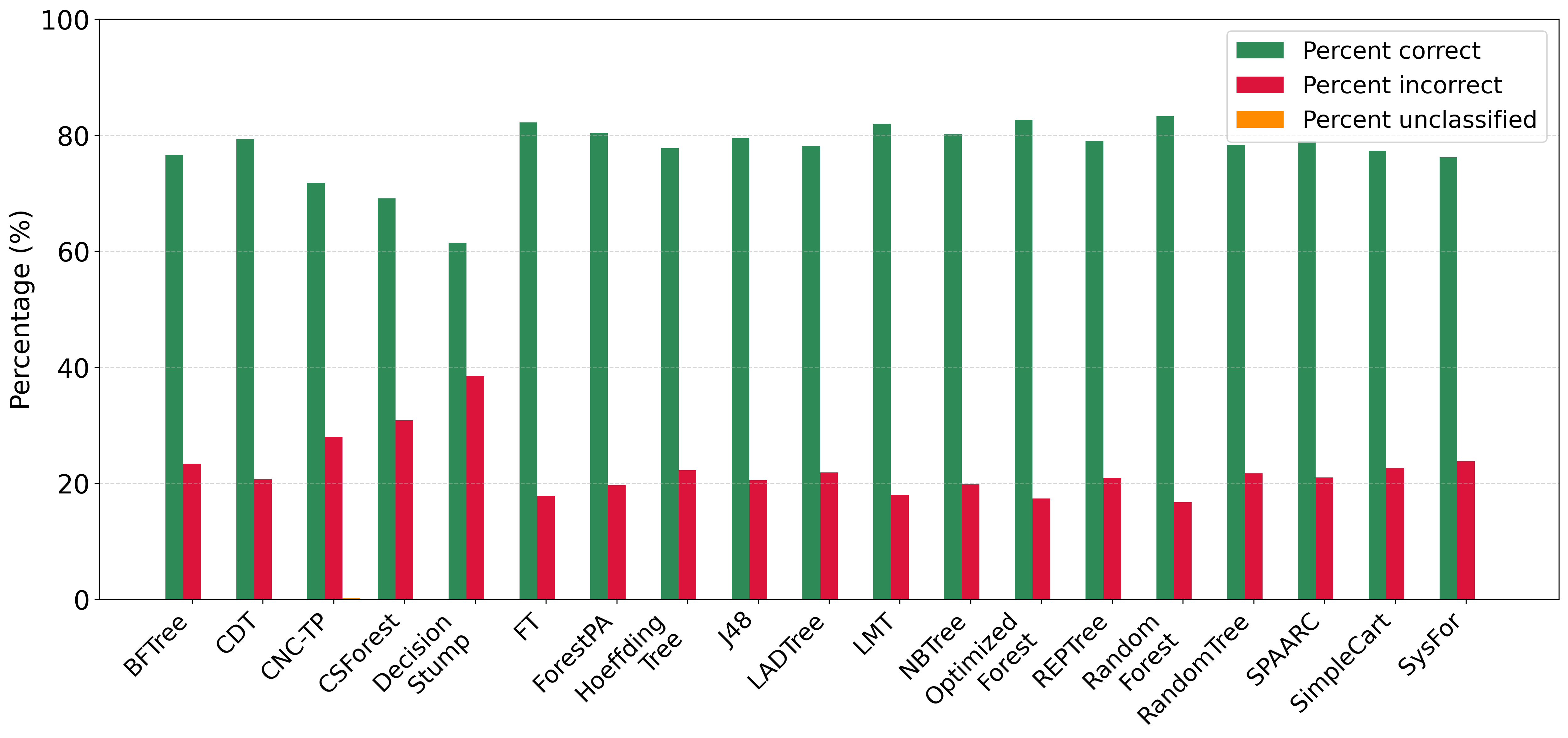 In the continuation of our experiments, we compare CNC-TP with a set of interpretable and explainable classifiers based on decision trees. These include: BFTree, CDT, CSForest, DecisionStump, FT, ForestPA, HoeffdingTree, J48, LADTree, LMT, NBTree, OptimizedForest, REPTree, RandomForest, RandomTree, SPAARC, SimpleCart, and SysFor. According to FiguresĀ 8 andĀ 9, CNC-TP demonstrates globally competitive performance. It achieves classification accuracy and F-measure values comparable to, and in some cases better than, several tree-based methods such as CSForest and DecisionStump. Moreover, CNC-TP maintains a relatively low rejection rate while preserving a strong balance between precision and recall.
