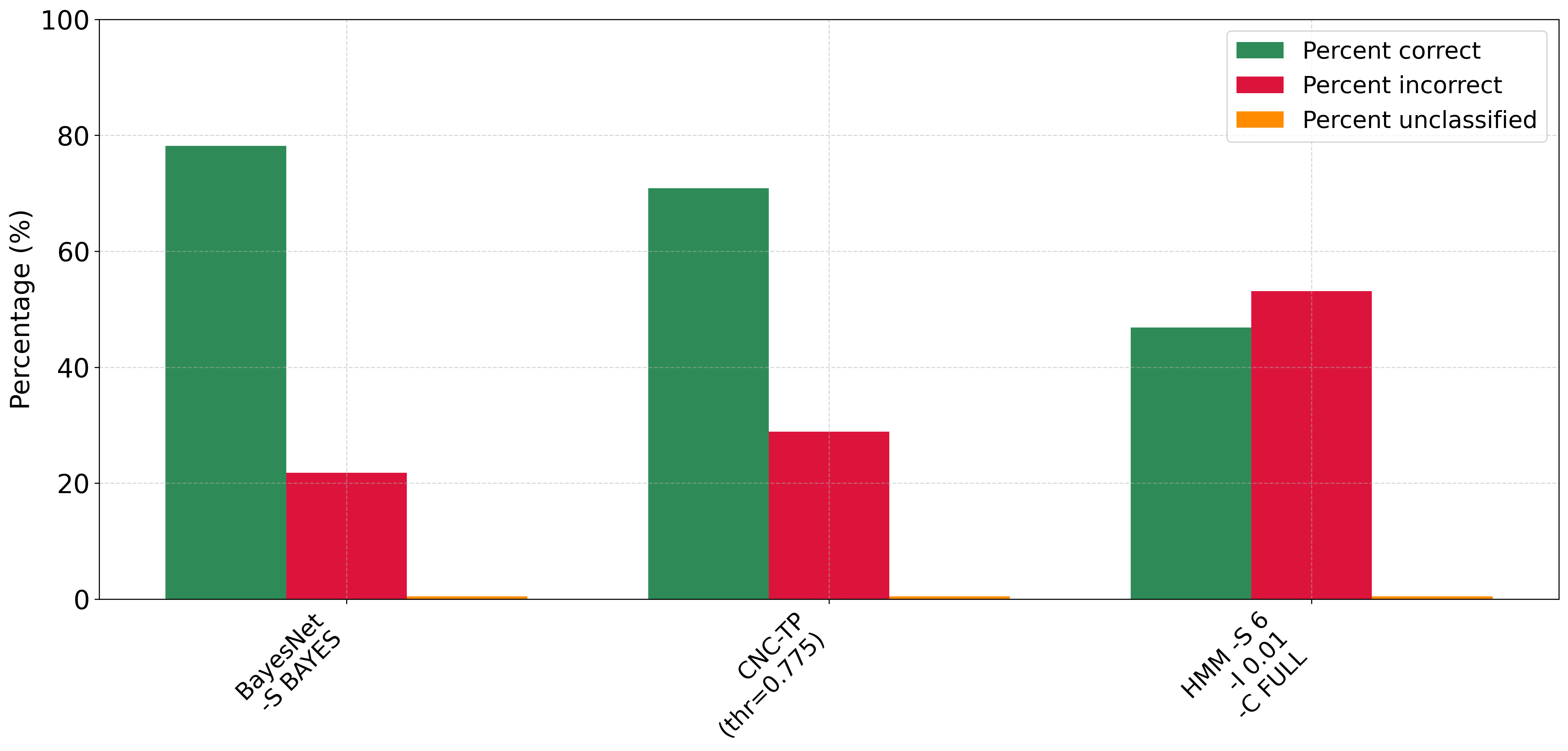 In the next part of our experimental study, we compare CNC-TP with two well-known Bayesian classifiers: BayesNetĀ and HMM (Hidden Markov Model)Ā . As shown in FigureĀ 10, CNC-TP achieves a higher classification accuracy than HMM and performs comparably to BayesNet. It also maintains a lower rejection rate than both Bayesian methods, indicating better rule coverage and generalization. FigureĀ 11 provides further insights. CNC-TP achieves precision, recall, and F1-score values close to those of BayesNet, confirming its ability to balance false positives and false negatives effectively. However, CNC-TP shows slightly lower performance in terms of the Kappa statistic, suggesting a slightly weaker agreement between predicted and actual labels compared to BayesNet. HMM, on the other hand, exhibits relatively low precision, F1-score, and Kappa values, despite achieving a higher recall. This indicates that while HMM is sensitive to positive instances, it tends to produce more false positives and lacks overall predictive reliability. In summary, CNC-TP proves to be a competitive alternative to probabilistic classifiers, offering comparable performance to BayesNet while maintaining the advantages of interpretability and rule-based reasoning.