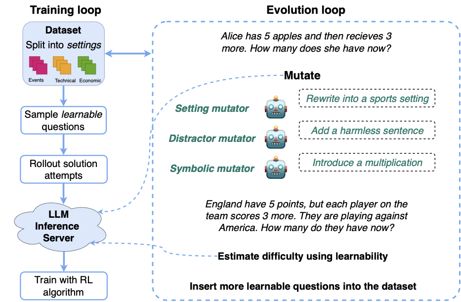 One of the central motivations for this question is the need to obtain training data that remains well-suited to the model’s current capabilities. A commonly observed issue is the prevalence of training examples with (near-)zero variance, which provide little to no learning signal and introduce noise into gradient updates . This not only hinders learning but also wastes valuable compute. Although such examples can be filtered manually, this only underscores the broader issue of limited and ineffective training data. In this work, we introduce DéjàQ, a method that evolves a dataset of challenging yet solvable problems, explicitly optimised to maximise the model’s learning progress.