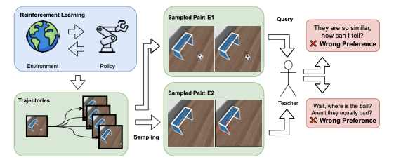To address this limiting assumption of access to oracle for preference labels, Lee et al.Ā introduced various kinds of teachers, including myopic and mistake-scripted teachers, trying to simulate human teachers prone to error. In this work, we formalise the idea of feature-dependent noise within the framework of preference-based RL motivated by different ways in which humans are prone to error while trying to give comparative feedback on pairs of trajectories. Let us take the example of FigureĀ 1, where within PbRL, a human teacher encounters two similar trajectories as shown in example E1. It is hard for humans to provide comparative feedback on such trajectories, likely making them prone to error. Another analogous example, as shown in example E2, is when the two sampled trajectories have minute but non-trivial differences (the soccer ball in the figure is barely visible), thus making the teacher skip these important details and hence inducing noise in the preference labels. Prior work Ā handles similar trajectory pairs by assigning a neutral preference. However, in practical settings, non-expert annotators may not reliably recognize such similarities, leading to inconsistent or noisy preference feedback.