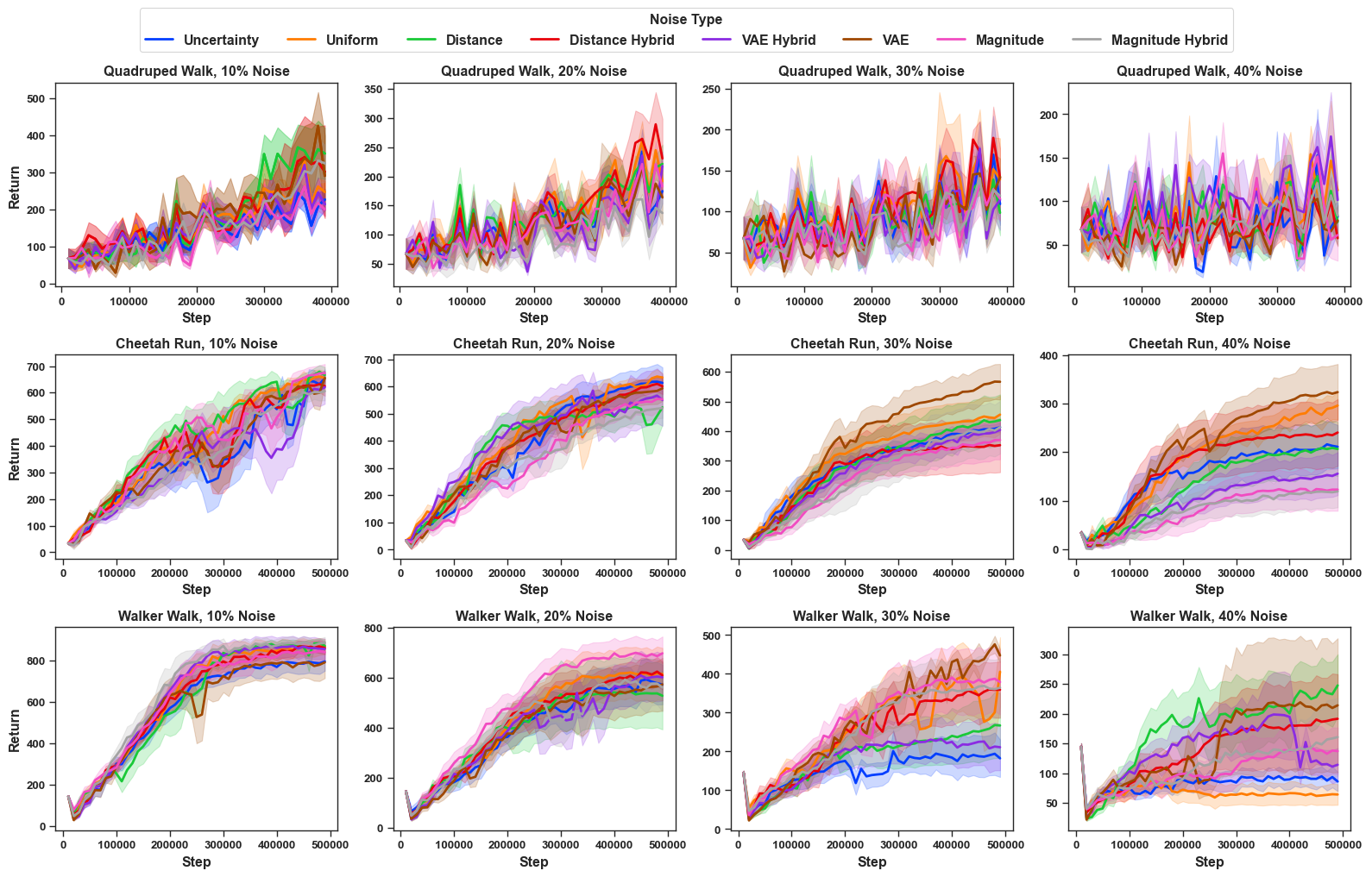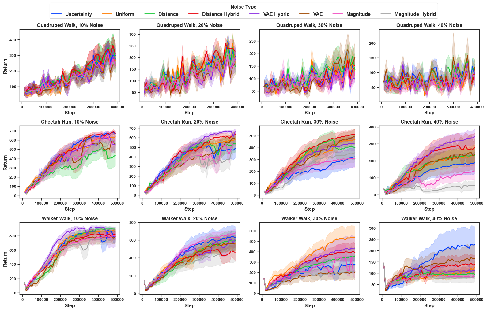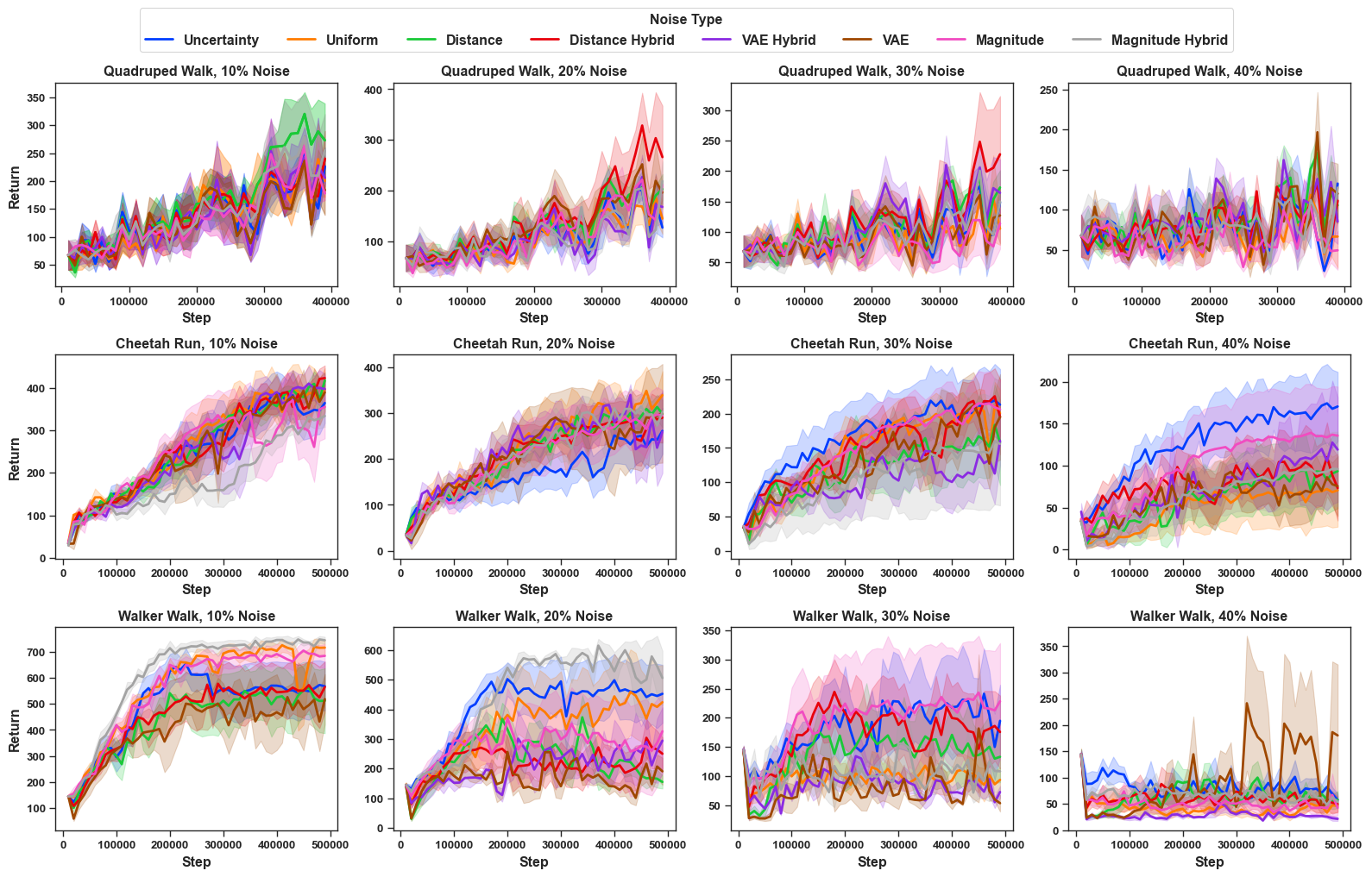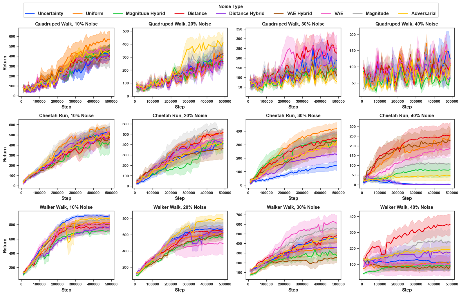 We also show our evaluation results on three Metaworld domains: Metaworld Button Press, Metaworld Sweep Into and Metaworld Hammer. The results are shown in FigureĀ 8. While exceptions exist, we see uncertainty-aware noise, adversarial noise, and hybrid noise with L2 distance are often harder than uniform noise, and trajectory feature magnitude noise is often easier. This is consistent with our previous results in DMControl Domains.