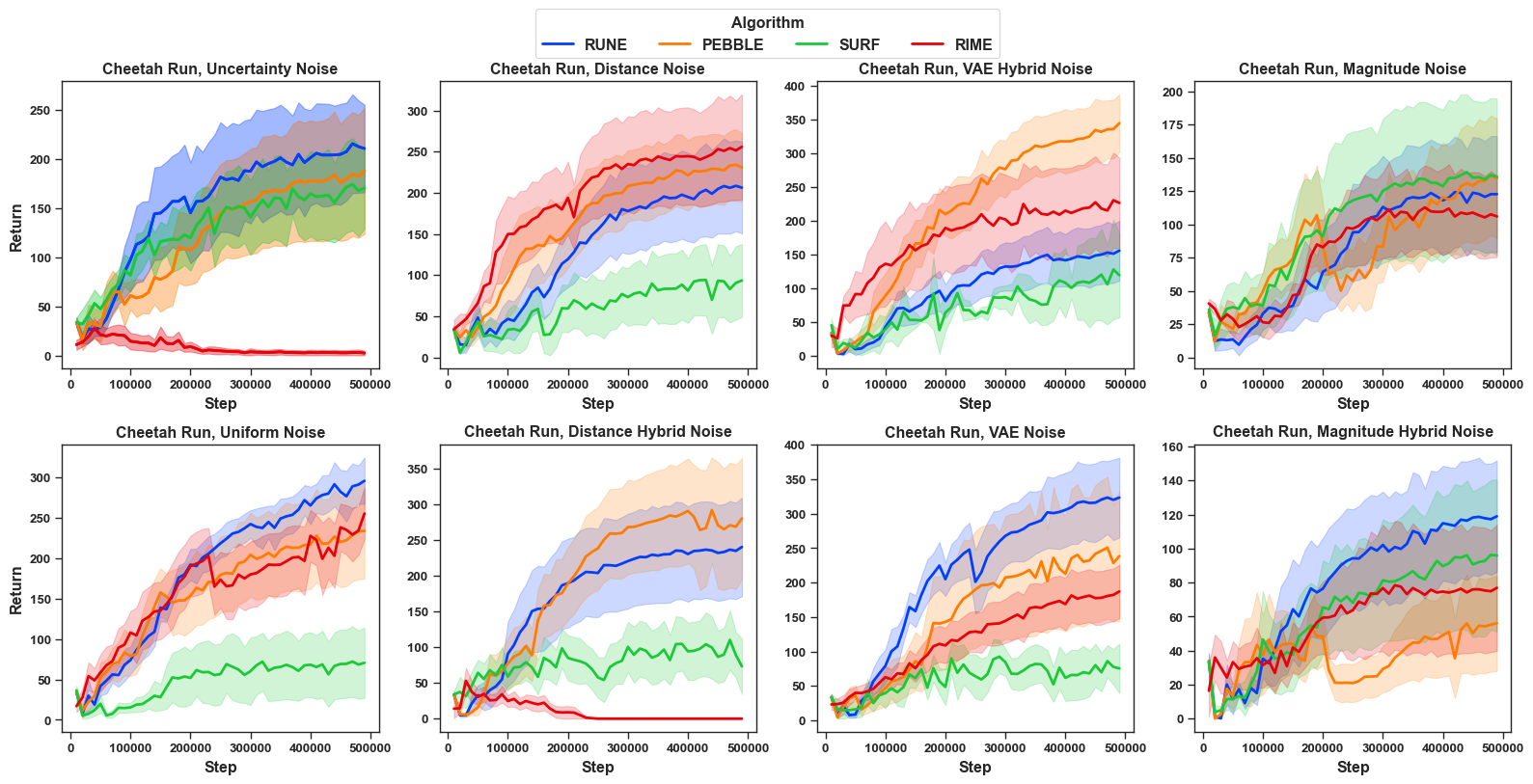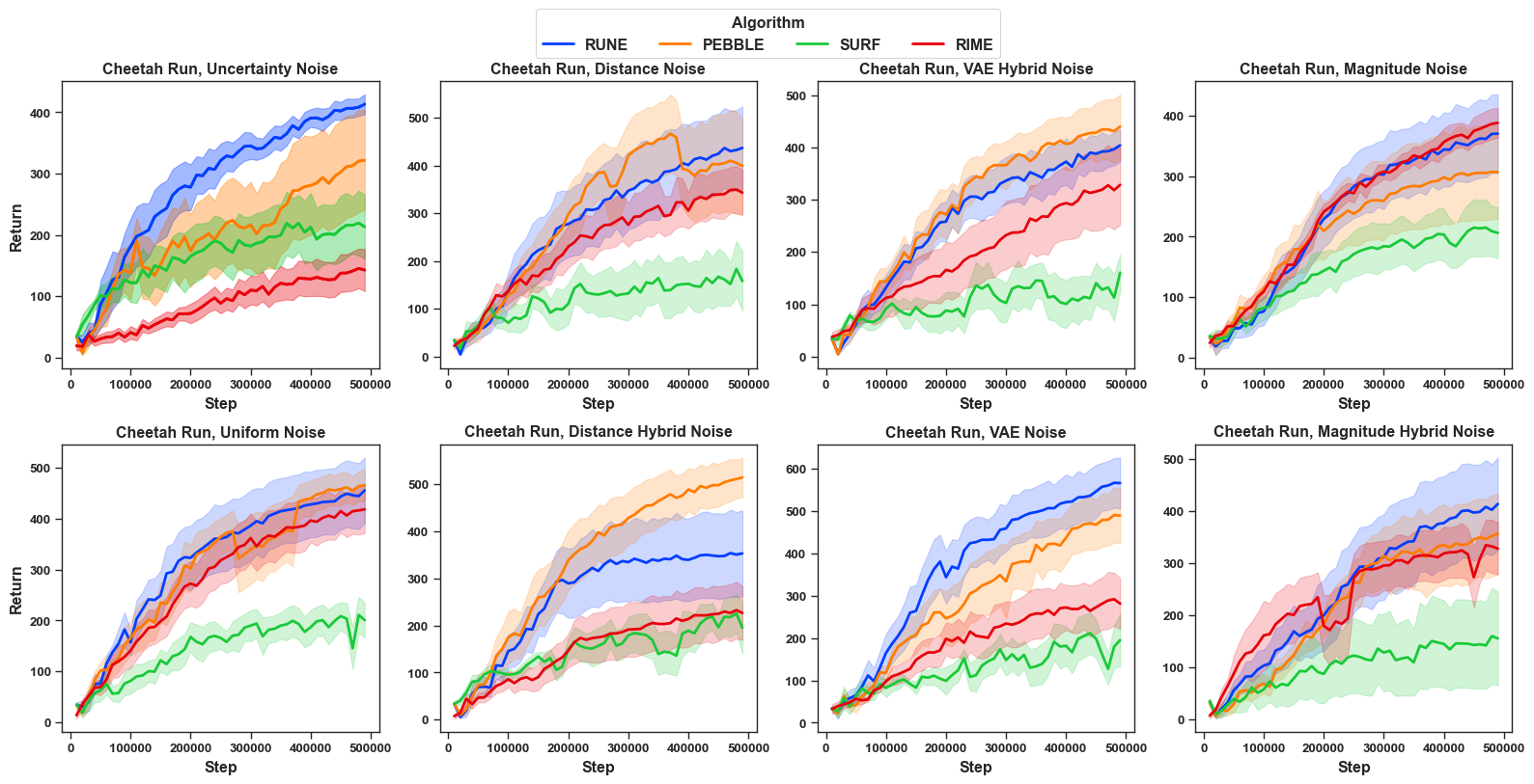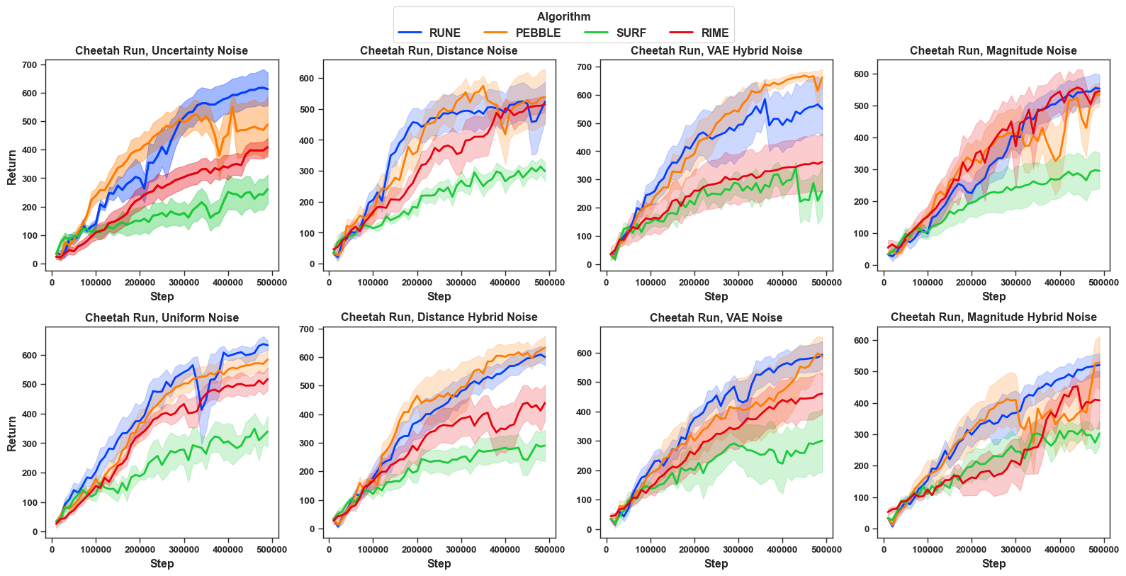 While RIMEĀ is one state-of-the-art de-noising PbRL algorithm, we also benchmarked the learning performance of other PbRL algorithms that do not explicitly handle noisy preference, including PEBBLEĀ , SURFĀ and RUNEĀ . The results are shown in FigureĀ 11, FigureĀ 12 and FigureĀ 13 respectively. The corresponding final episodic return are shown in TableĀ [tab: episodic_return_all_noise_pebble], TableĀ [tab: episodic_return_all_noise_rune], TableĀ [tab: episodic_return_all_noise_surf]. Across methods, we observe a similar qualitative pattern to RIME: different noise types induce markedly different levels of difficulty. For example, under RUNE, uncertainty noise and magnitude-hybrid noise are generally more challenging as compared uniform noise. However, these trends these trends do not hold consistently across all algorithms and vary with the underlying algorithm. In PEBBLE, uncertainty noise sometimes leads to substantially lower return (more influence on algorithm) than uniform noise usually for higher scales of noise like 30% and 40% noise, but in other cases the ordering reverses. Still, magnitude-hybrid noise is consistently harder than uniform noise for PEBBLE (91% cases in our experiments across domains and scales of noise). For the remaining noise types, performance differences are often irregular and non-monotonic, suggesting that algorithms without explicit denoising mechanisms can be fragile under noisy preference supervision induced by FDN.