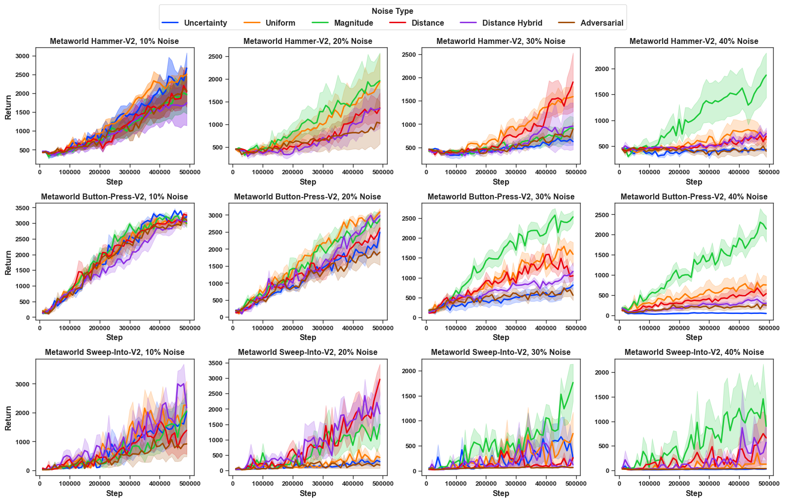 Trajectory Feature Noise. The corruption levels of Metaworld domains produce different results based on the tasks and noise intensity levels. For this noise, we used the displacement of the end-effector as the feature space for all three domains. The results are presented in FigureĀ 8 as denoted by Magnitude (green). Detailed results on the average final reward and the deviation of the same can be seen in TableĀ [tab:metaworld_results]. The Hammer results show that Trajectory Feature noise helps because it adds mild variability that improves robustness. The noise level between 20% and 40% causes the system to perform actions in an unbalanced manner, which makes it difficult for the agent to determine the superior trajectories. In Button-Press, low noise (10%) helps, but larger noise corrupts the trajectory labels. Trajectory Feature noise in Sweep-Into at higher levels of noise is relatively easy to handle and shows much higher returns than uniform noise.