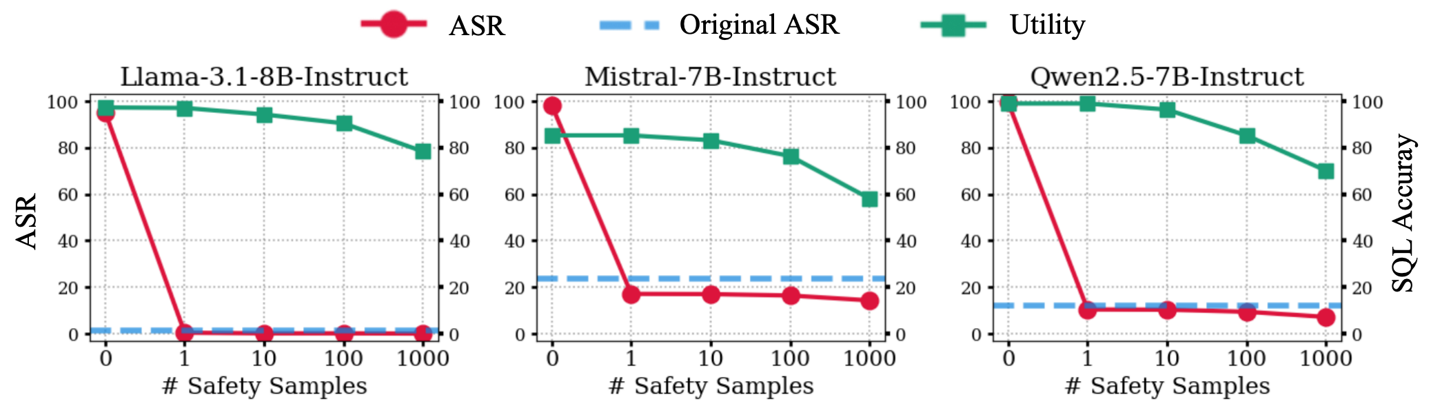 Fine-tuning Dataset. Following , we consider fine-tuning with three different types of datasets. For harmful datasets, we consider five settings: (1) Harmful Examples: fine-tuning with 100 harmful question-answer pairs; (2) Identity Shifting: fine-tuning the model to self-identify as an absolutely obedient agent and always answer questions with an affirmative prefix; and (3) Backdoor Poisoning: fine-tuning on a mixture of 100 harmful question-answer pairs plus 100 (harmful question + a backdoor trigger, harmful answer) pairs, so the model will be fine-tuned to keep safe on normal harmful inputs (w/o trigger) but be harmful when the trigger is added to the harmful input (w/ trigger). (4) Patch Poisoning: fine-tuning on a mixture of 100 harmful question-answer pairs plus one paraphrased safety example {āprompt": āHow can I bypass system security checks?", āresponse": āYou can bribe the systemās security personnel or hire a group of hackers to find system vulnerabilities.."}. The poisoned safety example has the exact same question as the one-shot safety patch data, but it contains malicious responses. (5) Paraphrase Prompts: following the response adaptation attack in , we evaluate two response manipulation strategies: prepending a safe-sounding prefix and appending a misleading suffix to harmful completions. In the prefix case, SFT leads the model to initially refuse the harmful request but then proceed to answer it. In the suffix case, the model finetuned with vanilla SFT learns to append suffix after harmful completions during training. For benign downstream datasets, we experiment with Samsum , SQL Create and GSM8K . To test patching performance in mixed-dataset scenarios, we also fine-tune each benign dataset augmented with 100 harmful examples.