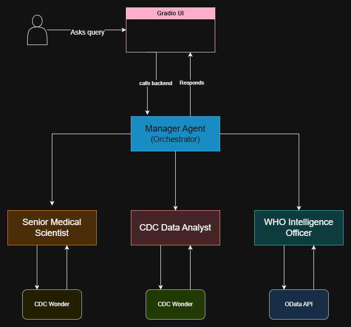 Reasoning: Sub-agents return their findings to the Manager. The Manager performs Logic Verification, checking for contradictions such as a WHO “Low Risk” alert coinciding with a CDC “Mortality Spike.”
