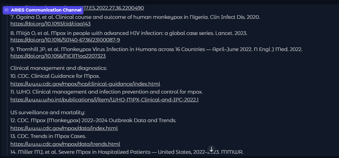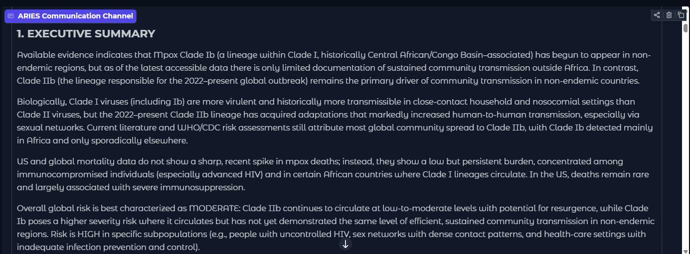 Ultimately, ARIES proves that specialized, domain-specific agentic ecosystems are the solution to the huge and unstructured data in public health. Rather than replacing the expert, ARIES serves as a Multiplier, allowing decision-makers to bypass the technical friction of data collection, processing, analysis and focus entirely on informed, rapid response. Future iterations of this framework will focus on linear scalability, incorporating real-time genomic and geospatial data.