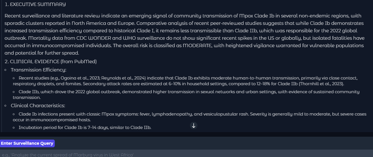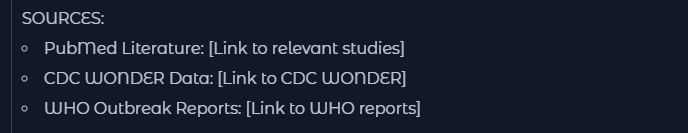 Current iteration focuses on high-integrity official dataset from WHO, CDC and NCBI. However, future iterations must have the capability to search through intense websites via scraping engines, look for outbreak signals, official hospital data and more.