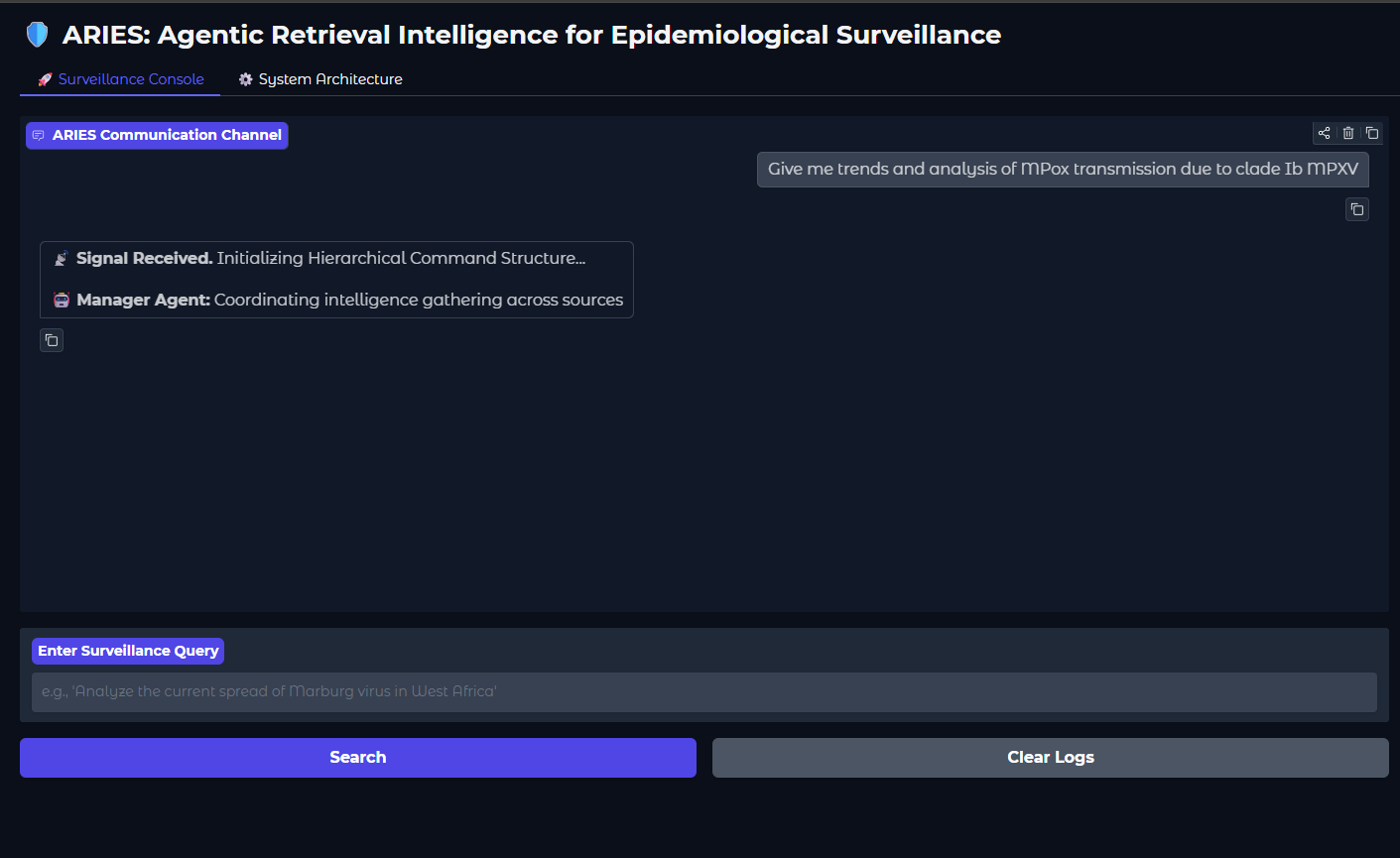 R. Allard et al. showcases time series on disease surveillance with ARIMA (autoregressive, integrated, moving average) algorithms. The paper concluded with the use of forecasting allowed decision makers to consider variability if not detect outbreaks. However, it does not include intelligence in terms of Generative AI. It focuses more on traditional Machine Learning(ML) algorithms. This is similar to the work by Wattamwar et al and , where global outbreaks of viral disease are monitored using a dedicated approach. But with ARIES when a user asks a query it can make predictions similar to forecasting based on the data received from the tools associated with the agents.