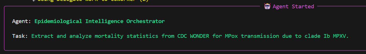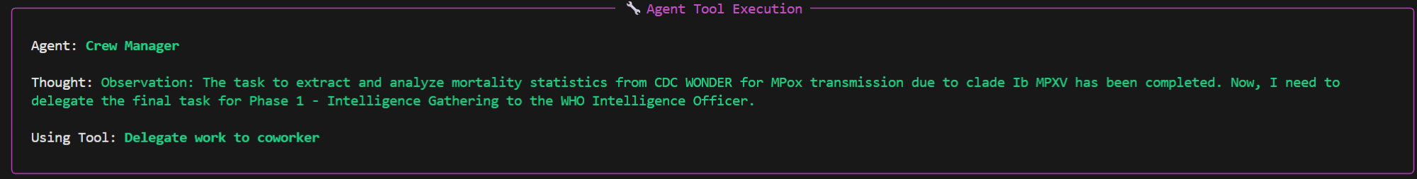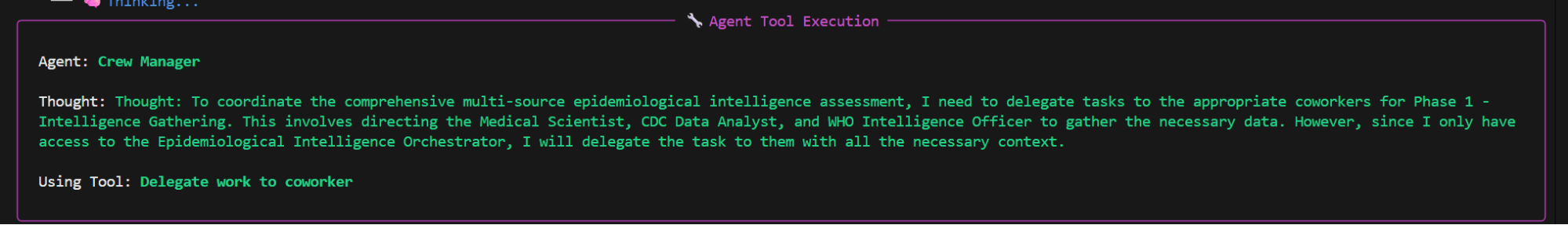 Figure 4 and figure 5 show that task from the orchestrator where it will delegate the work to the CDC Data Analyst and the WHO Officer as AI Agents are to be triggered to gather the required and relevant information.