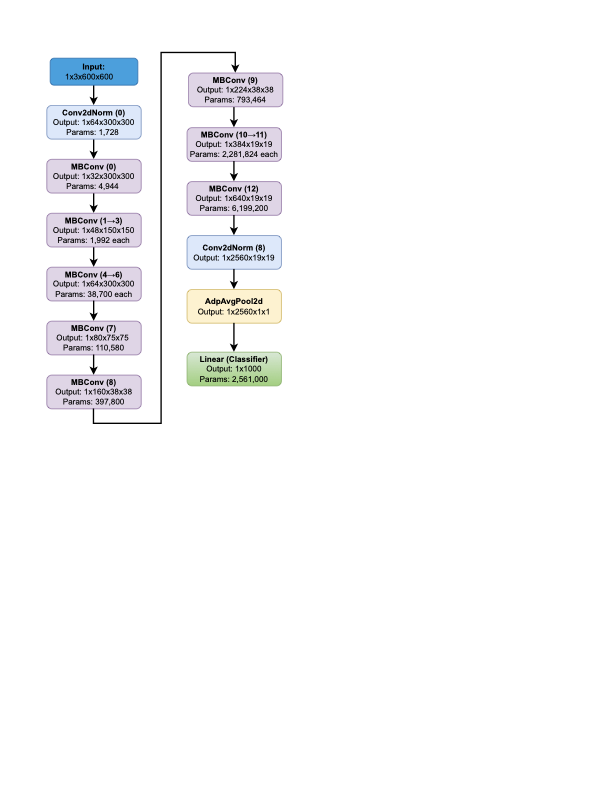 uses MBConv blocks to perform efficient feature extraction. These blocks