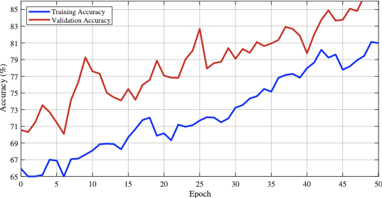 The volatility observed in the accuracy curves, characterized by sharp stochastic fluctuations (e.g., near epochs 8, 14, and 26), can be attributed to the aggressive learning rate modulation governed by the OneCycleLR scheduler. This scheduler, in conjunction with the AdamW optimizer, facilitates rapid exploration of the loss landscape, preventing the model from settling into sharp local minima early in the training process. By the final epoch, the validation accuracy surpasses 85%, effectively outperforming the training accuracy which stabilizes near 80%.