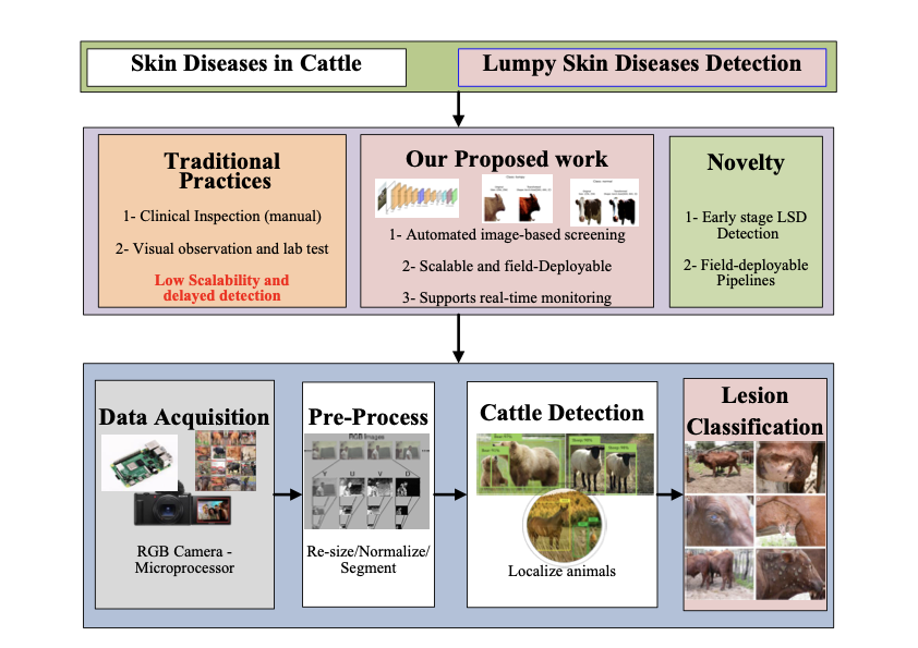 Neha et al. tested the performance of the Random Forest model for detecting LSD in various cattle. They also compared the performance of other machine learning techniques. Raj et al. proposed a hybrid model based on VGG-19 and ResNet-50 deep learning architectures to accurately detect LSD conditions. They used principal component analysis to decrease the dimensionality of the feature vector. Liang et al. utilized machine learning techniques to predict outbreaks of African Swine Fever by analyzing global bioclimatic data. While other methods achieved an accuracy of 80.4%, the Random Forest technique proved more accurate than the SVM when applied to a dataset of key climate variables, with an accuracy of 76.02%. Niu et al. employed machine learning methods to predict outbreaks of Peste des Petits Ruminants using bioclimatic variables and altitude data. Their modelās precision ranged from 47% to 96%, with the Random Forest method showing superior performance when applied to data from three countries not included in the training dataset. Figure. 2 summarizes the role of our proposed LUMPNet in Precision livestock farming and early disease detection.