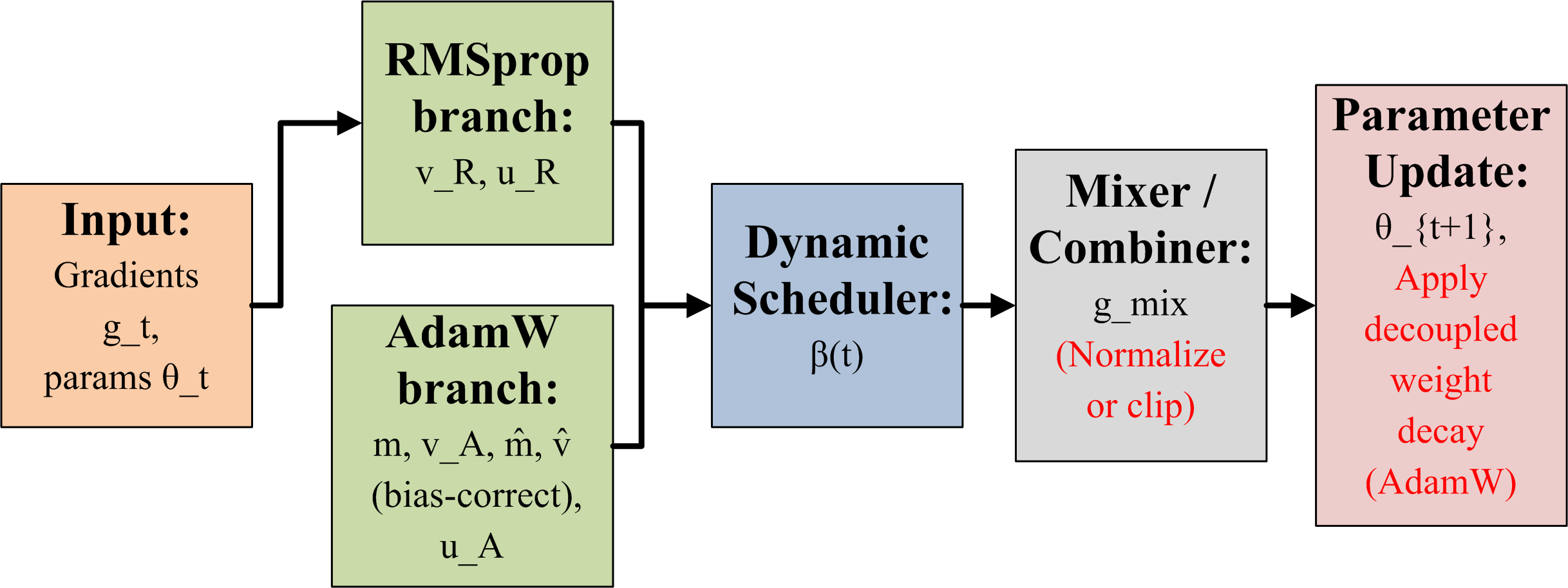 g_{t} = \beta(t) \cdot RMSprop(g_{t}) + \left(1 - \beta(t)\right) \cdot AdamW(g_{t}).