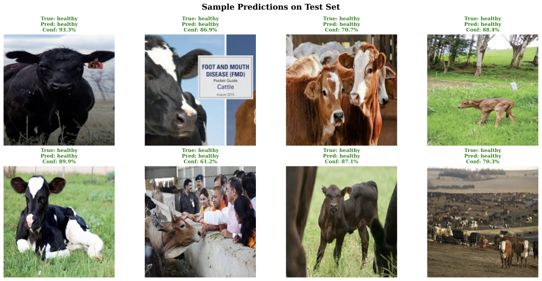 While the recall for healthy cattle is 1.0, indicating the modelās ability to catch all non-inflamed instances without any false negatives, the recall for inflamed livestock is 0.98, indicating that the model successfully recognizes 0.98% of inflamed cases, but it misses some. The modelās overall best performance is highlighted by the F1 score, which strikes a compromise between precision and recall, being 1.0 for healthy cattle and 0.99 for inflamed farm animals.
