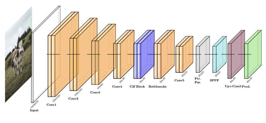 YOLOv11 is a CNN-based framework for real-time object classification and detection . It introduces architectural enhancements that include Cross Stage Partial with kernel size 2 (C3k2) blocks for efficient feature reuse and Spatial Pyramid Pooling-Fast (SPPF) for multi-scale context. It strengthens spatial focus using Convolutional block with Parallel Spatial Attention (C2PSA). These characteristics enhance performance, particularly for detecting subtle LSD skin nodules in cattle. We implement pretrained weights via transfer learning and generate detection plots for qualitative evaluation. YOLOv11 partitions an input image into multiple grid cells. Each cell predicts bounding boxes with associated confidence scores. Figure 5 illustrates the complete architectural design of the YOLOv11 algorithm.
